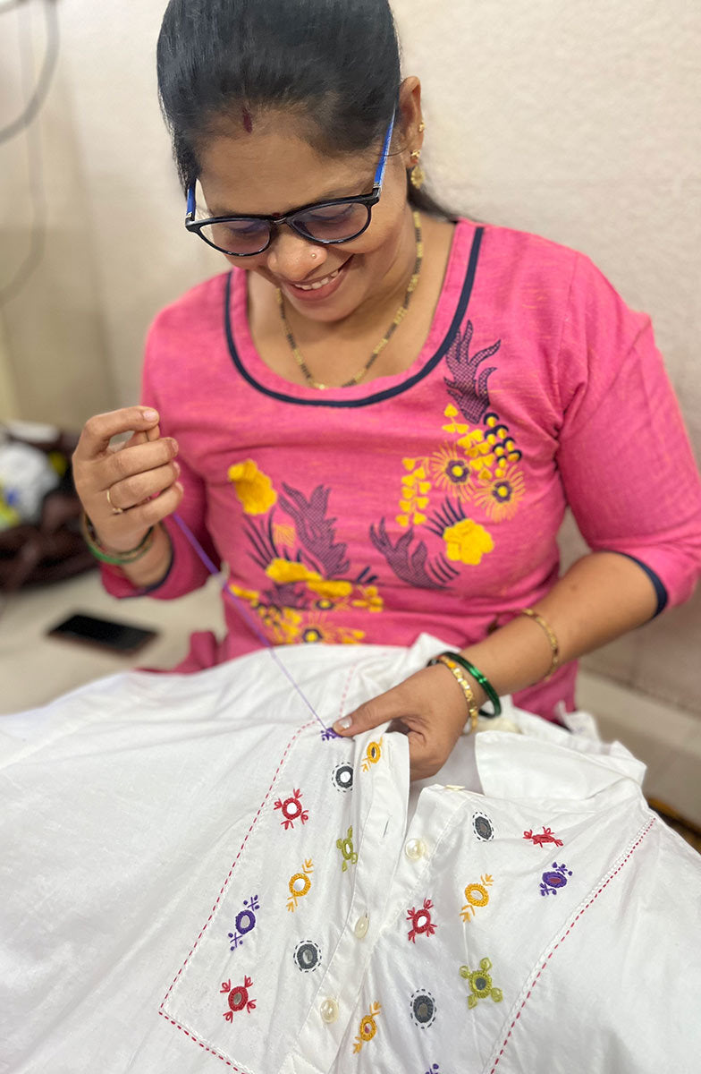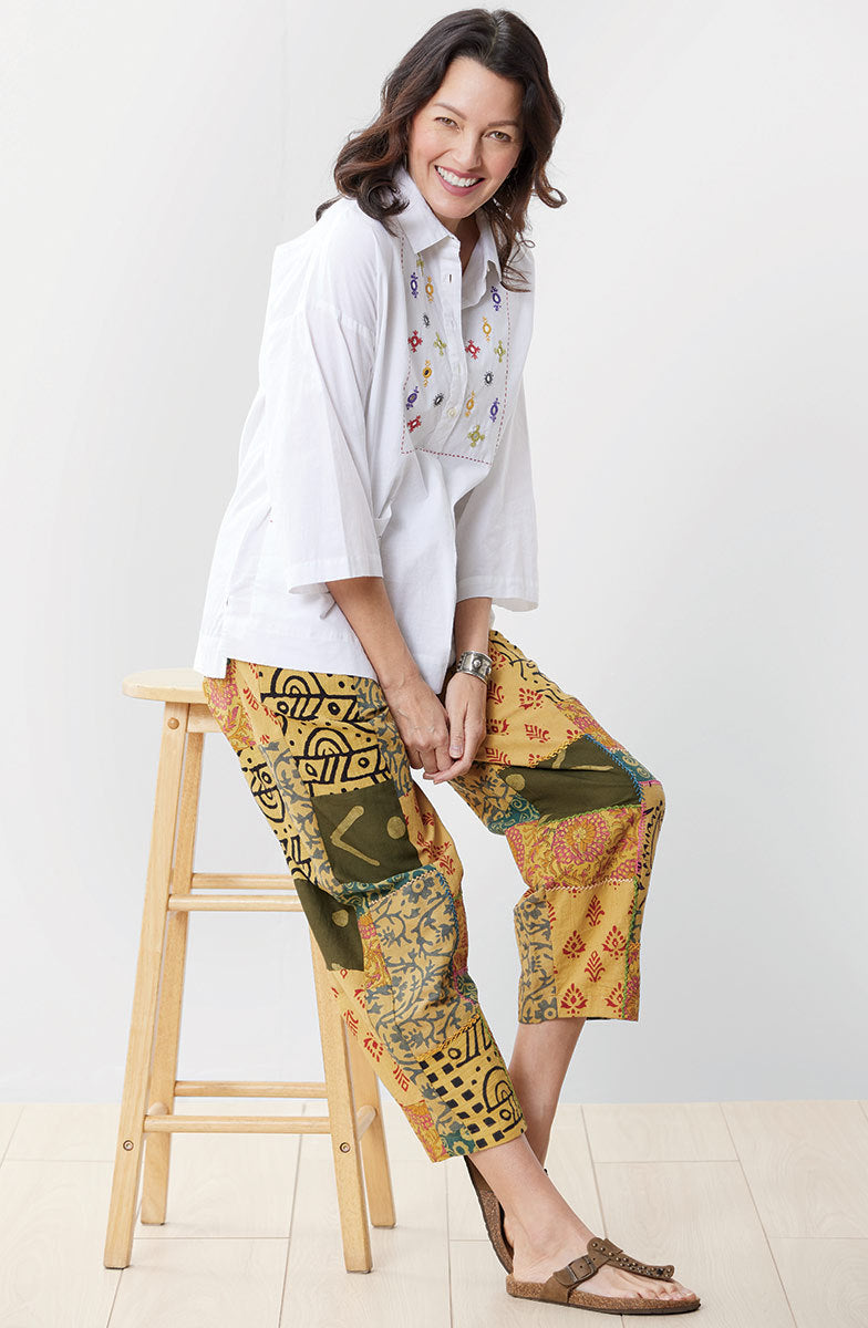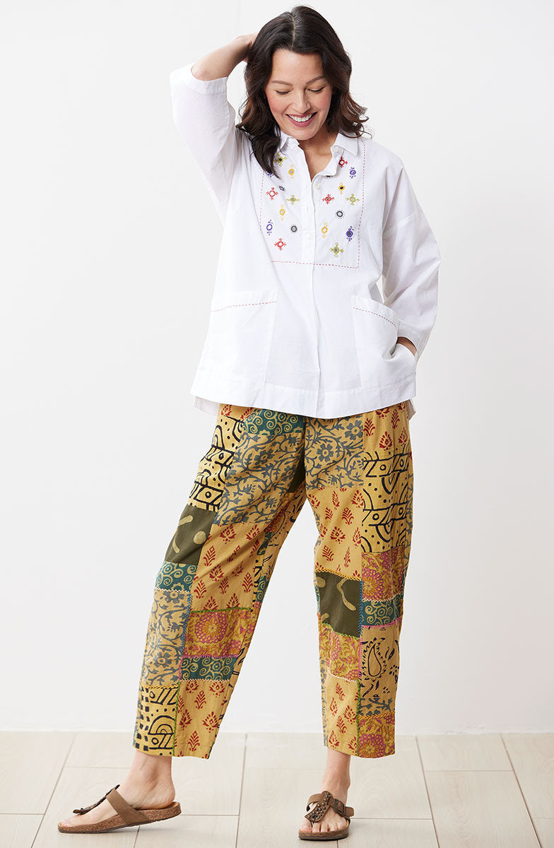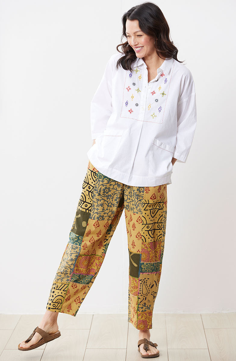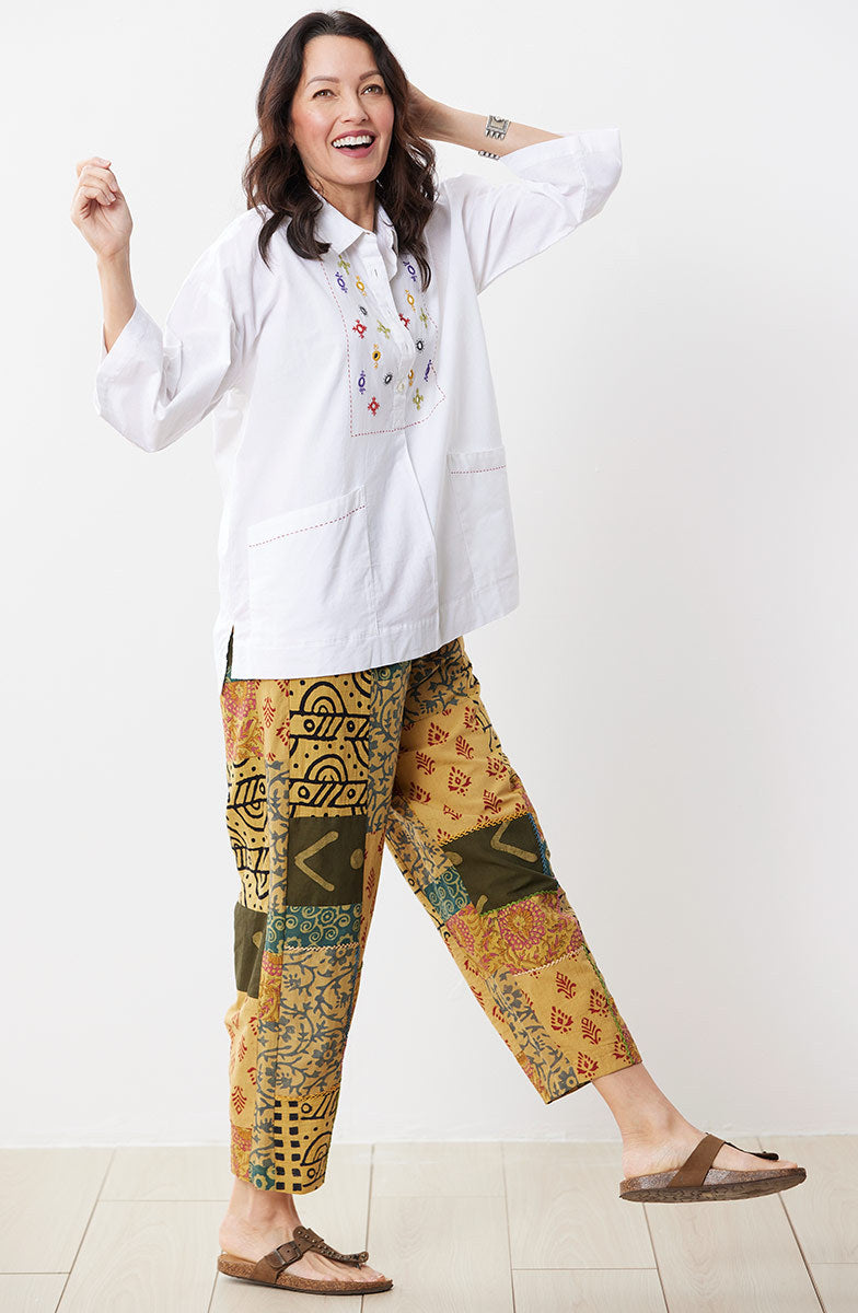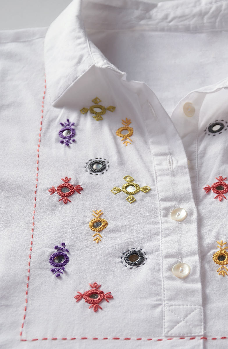 Shirt-collar organic cotton top with a yoke defined by mirror embroidery. The button placket is surrounded by hand embroidered designs with tiny reflectors in the center. Pullover style has slight high-low hem with side slits. Angled front pockets. Generously cut - consider sizing down for a less oversized look.