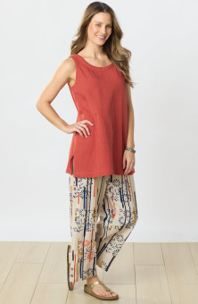 Fair Trade, Made by Artisan Women Stylish and comfy, our soft double gauze tank top goes with everything. Side slits give an easy sweep. Tone-on-tone hand embroidery embellishments. Longer length makes this ready to wear alone or layered.