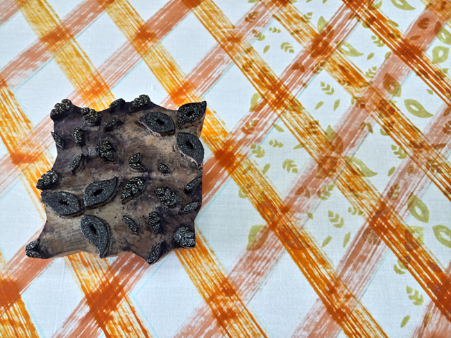 The stripes are done on the diagonal, a tricky placement which require the skill and eye of the experienced artisan to maintain continuity and placement. This lattice design then becomes the background for a more traditional hand-printed leaf design.