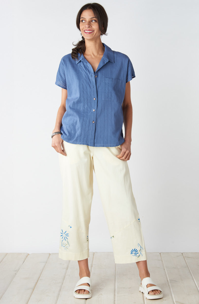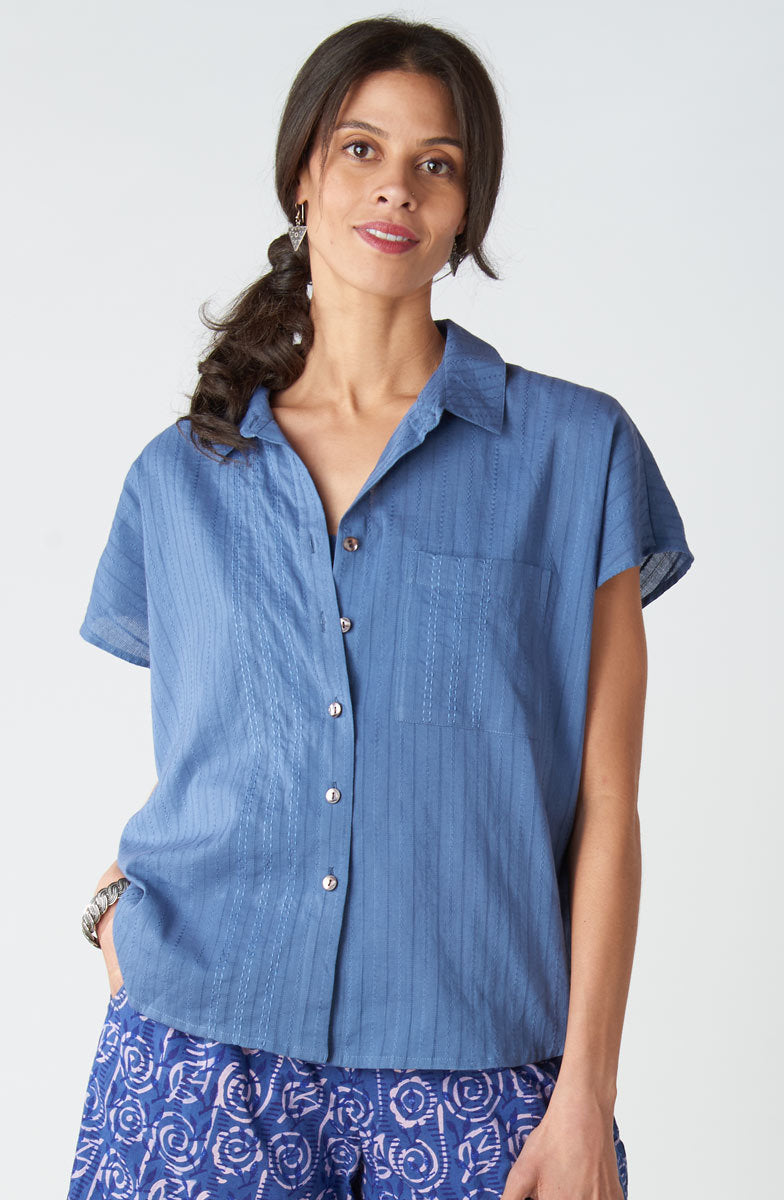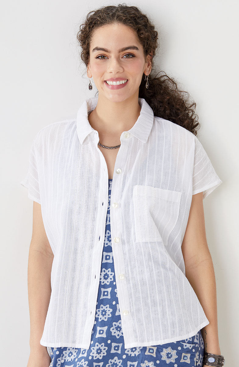 Lightweight slightly sheer shirt in soft textured cotton. Perfect for layering over your favorite dress or with a matching cami. Hand embroidery embellishments.