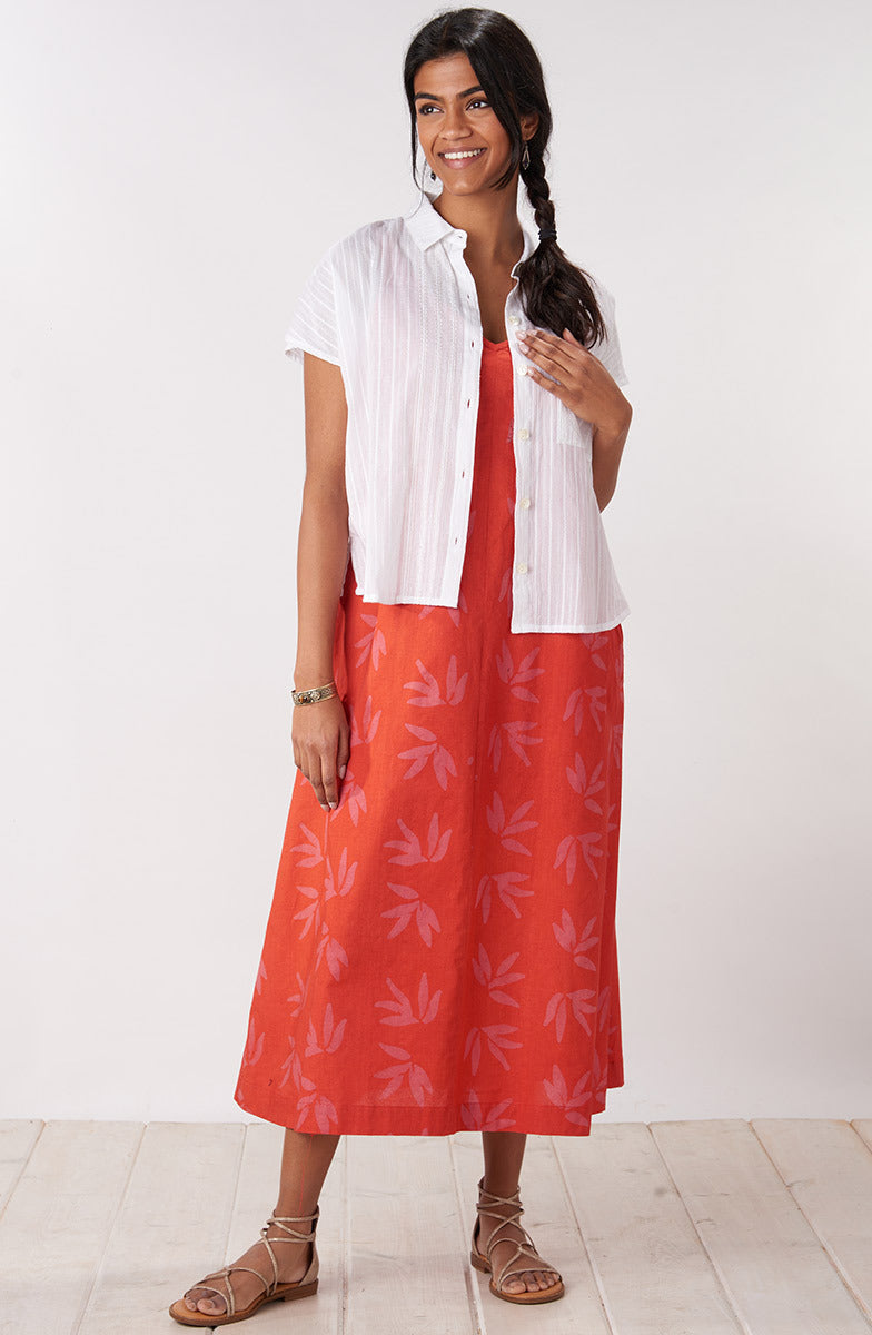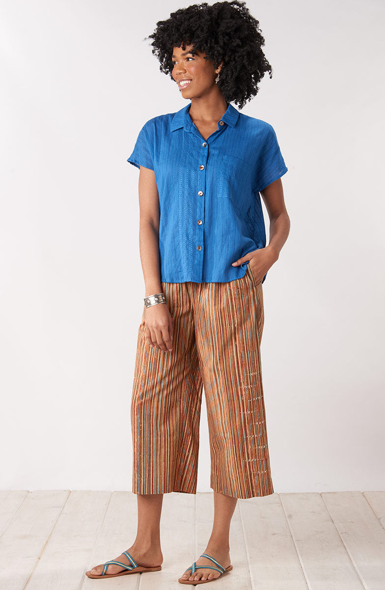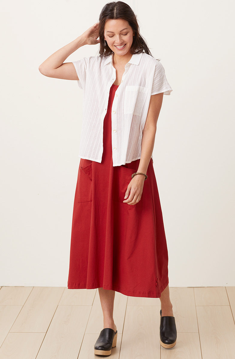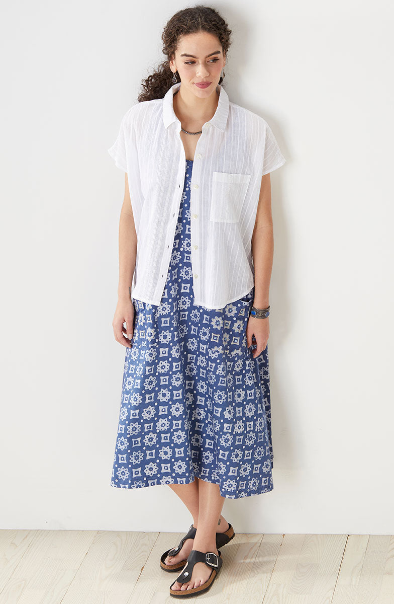 Lightweight slightly sheer shirt in soft textured cotton. Perfect for layering over your favorite dress or with a matching cami. Hand embroidery embellishments.