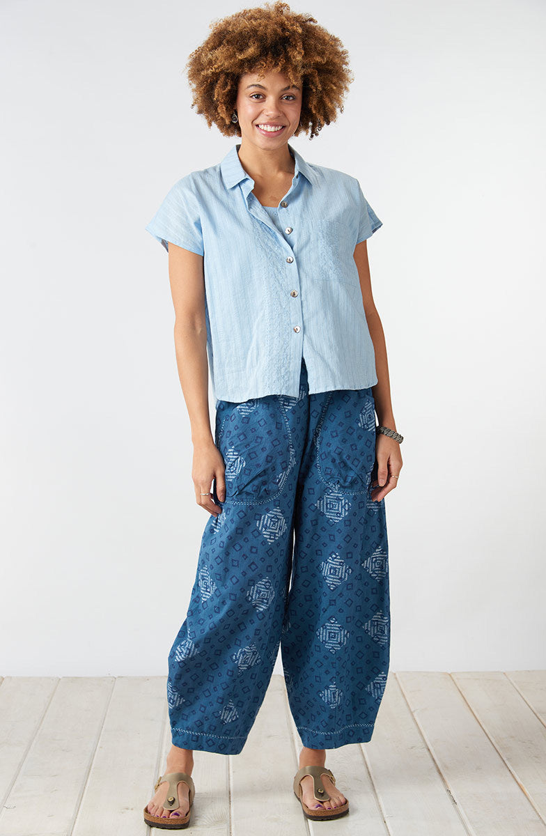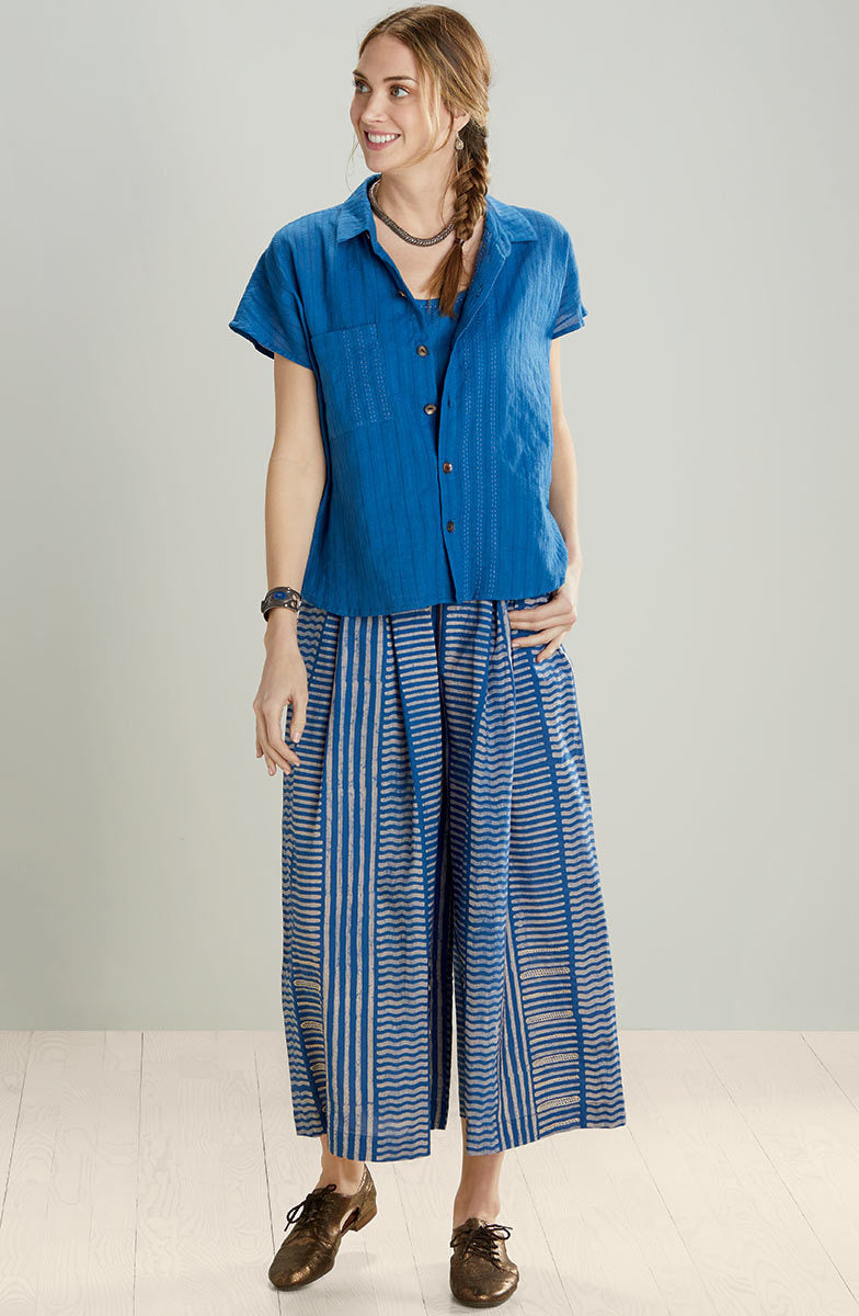 Garments are pre-shrunk. Our hand-printed and hand tie-dyed fabrics have been washed, sometimes multiple times, as part of the printing process. The fabric will not shrink in a cold water wash.