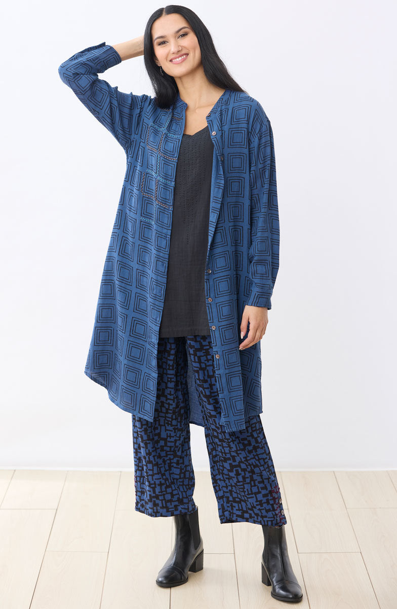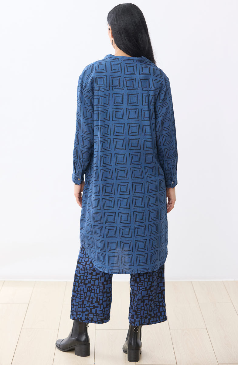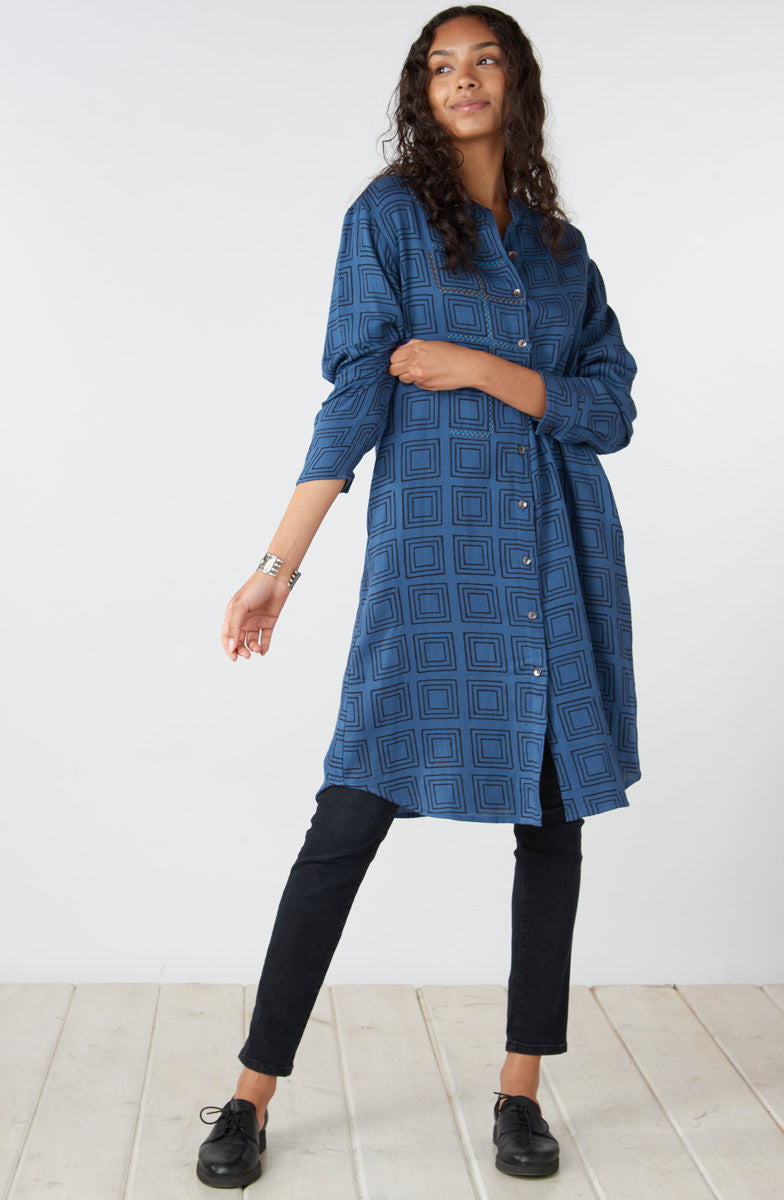 Fair Trade, Made by Prerna Cooperative Button-front long shirt in deep blue cotton crepe blockprinted with geometric shapes. This soft, versatile top works alone or as a dress or topper, too! Band collar, shirttail hem. Long sleeves with button cuffs. Hand embroidery accents the blockprint design.