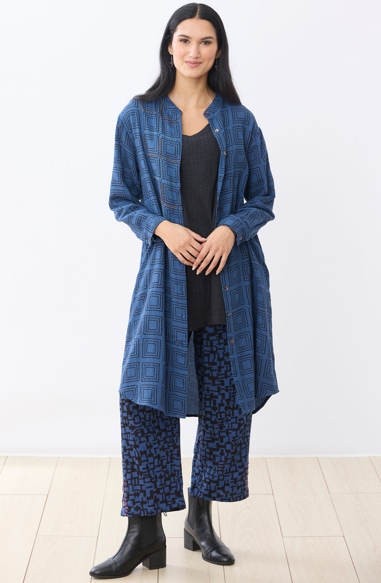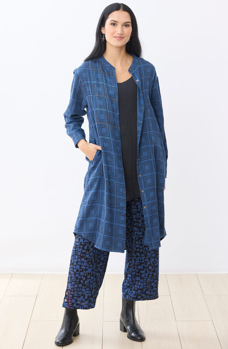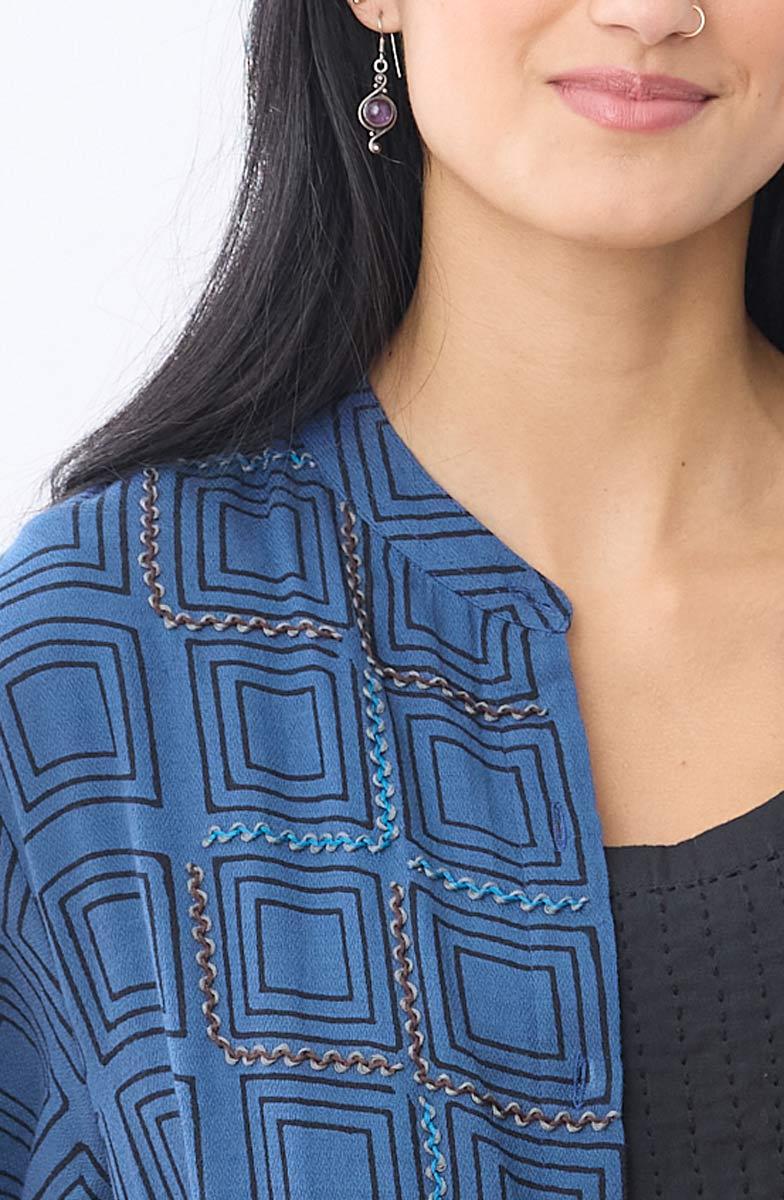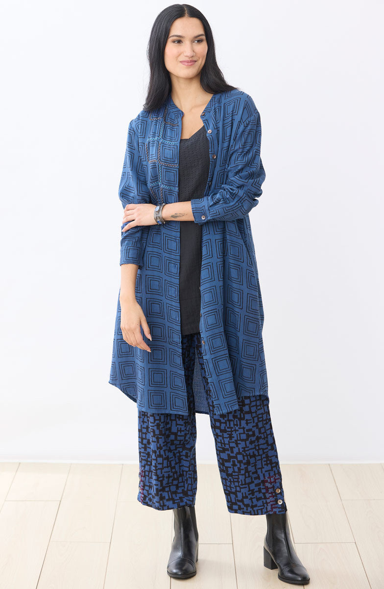 Fair Trade, Made by Prerna Cooperative Button-front long shirt in deep blue cotton crepe blockprinted with geometric shapes. This soft, versatile top works alone or as a dress or topper, too! Band collar, shirttail hem. Long sleeves with button cuffs. Hand embroidery accents the blockprint design.