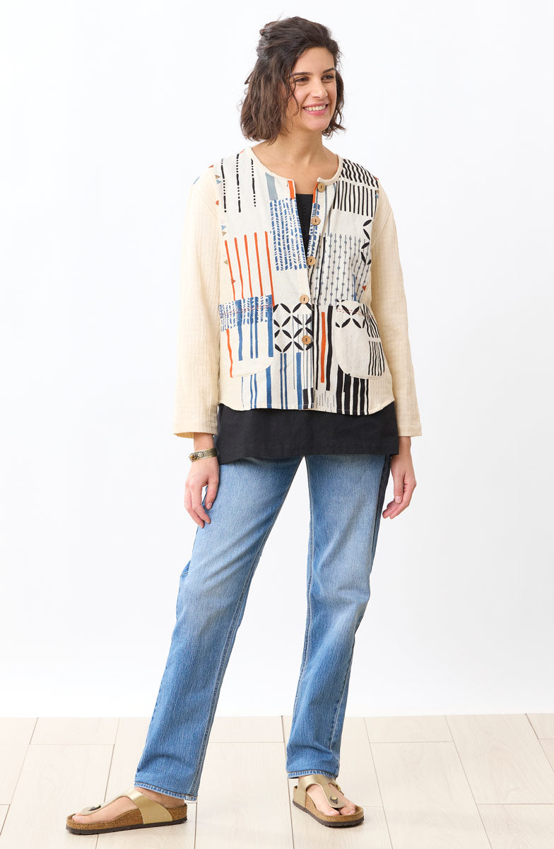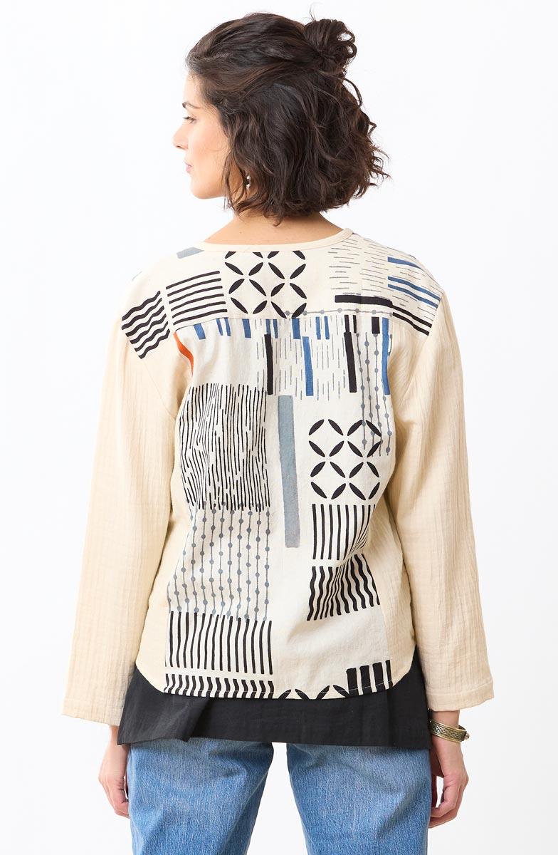 Wear it your way—buttoned up as a top or layered on as a lightweight jacket. This versatile piece is one you’ll reach for again and again. A collage of hand-printed cotton/linen insets adds artisanal character to the body of soft, breathable 100% cotton dobby double gauze. Finished with full-length sleeves and practical pockets for effortless, everyday wear.