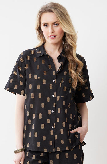 Classic camp shirt styling in lightweight cotton handprinted in dark gold batik with gold hand embroidery accents. Dropped shoulders and short sleeves give an easy, casual look. Shirttail hem. Generously cut - consider sizing down for a less oversized look.