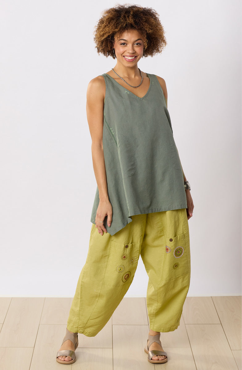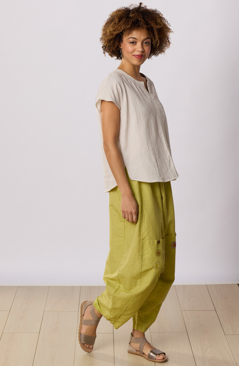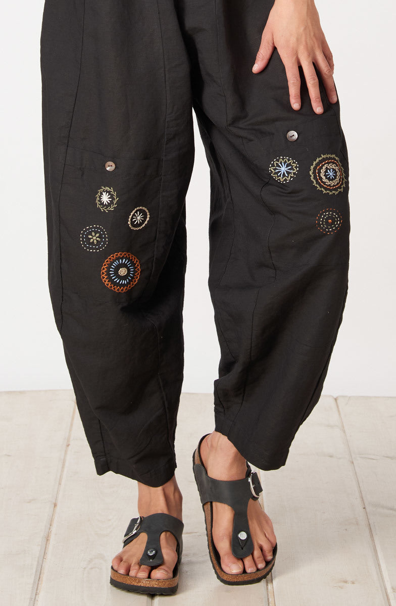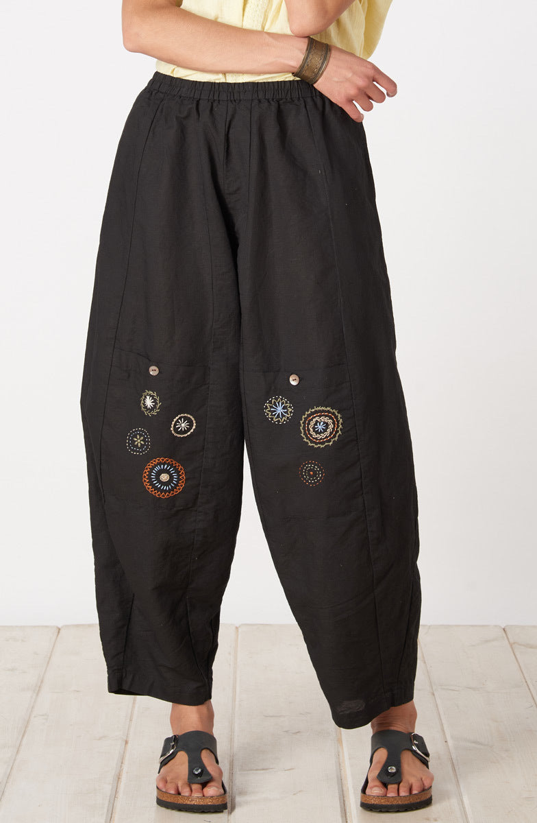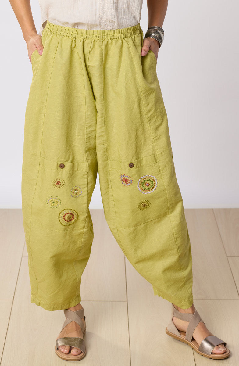 Your newest essential: a contemporary version of workers' field pants in a linen/cotton blend. Lantern-shaped leg and full elastic waist. Buttoned cargo pockets feature contrast hand embroidery. Generously cut.