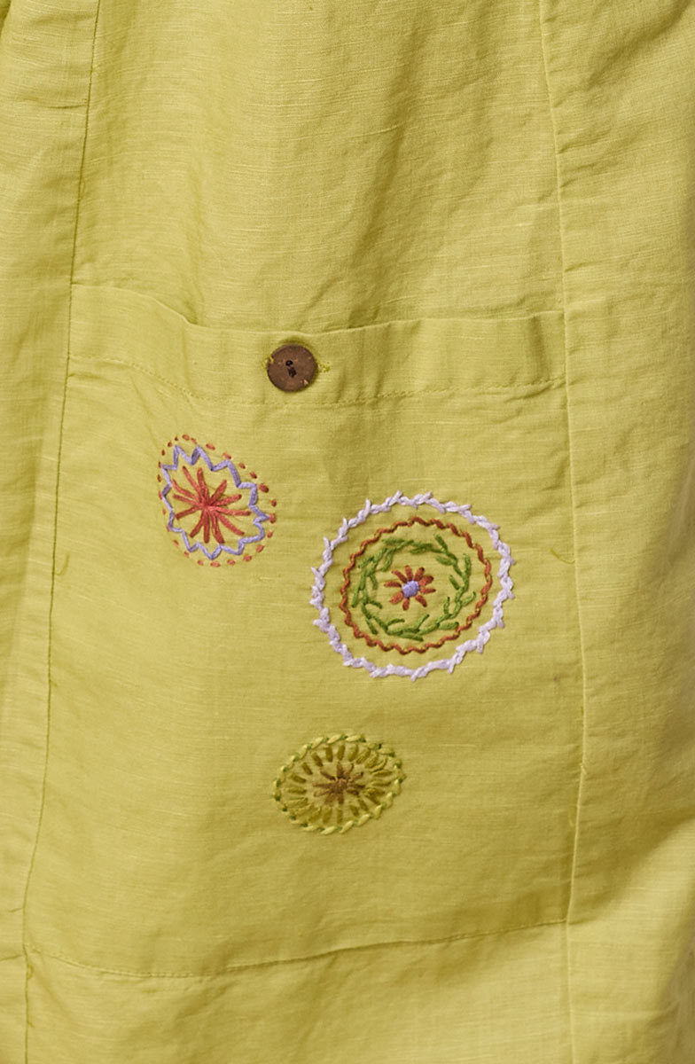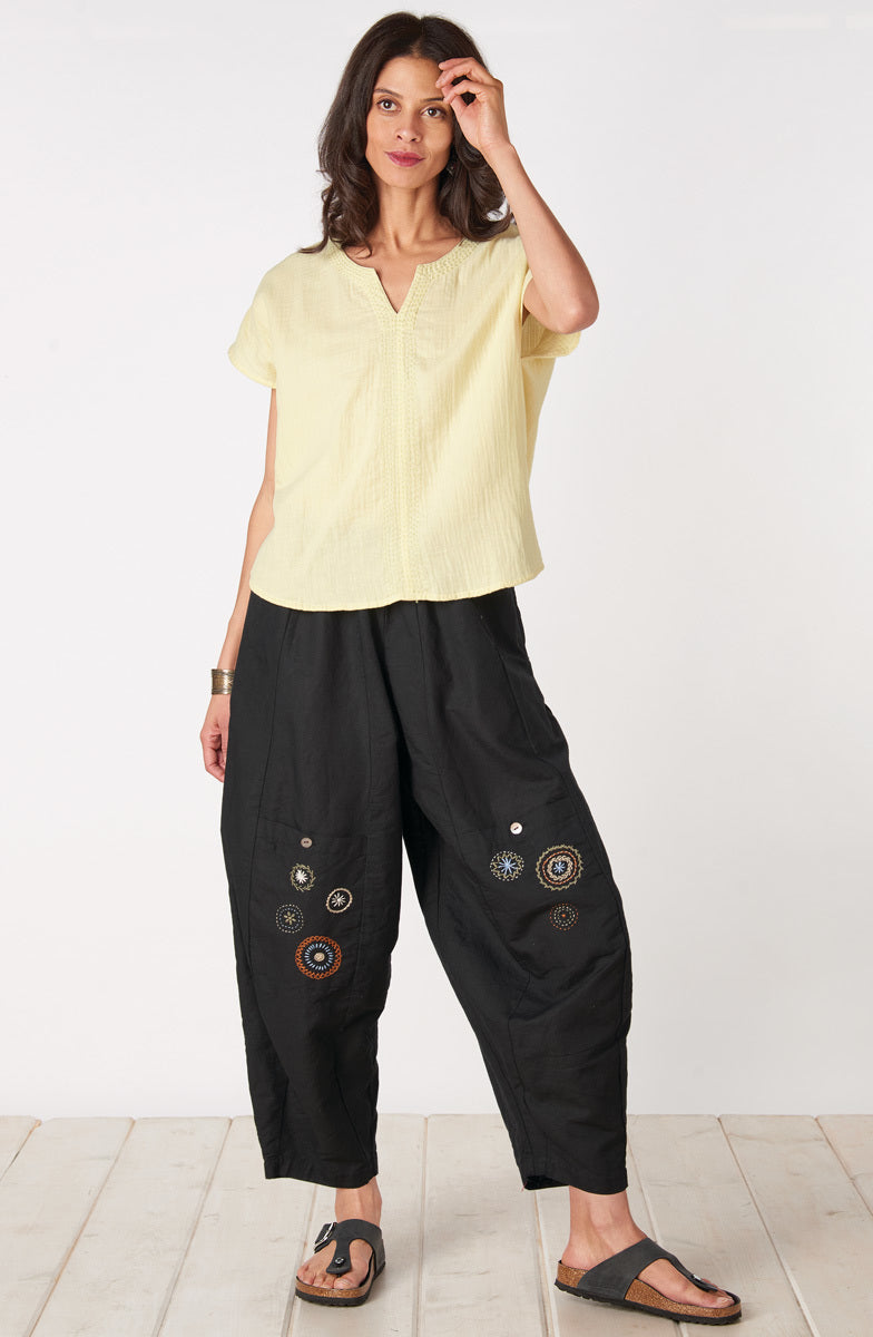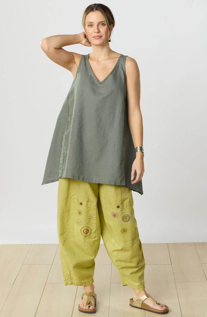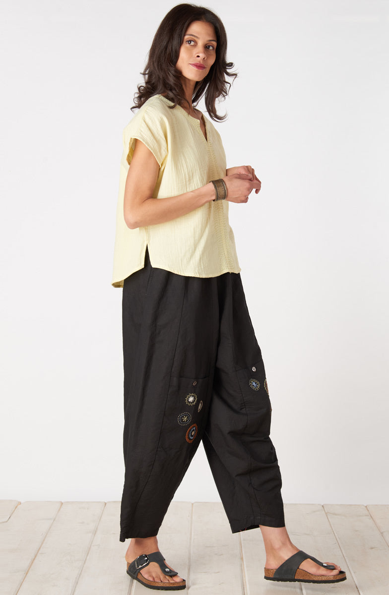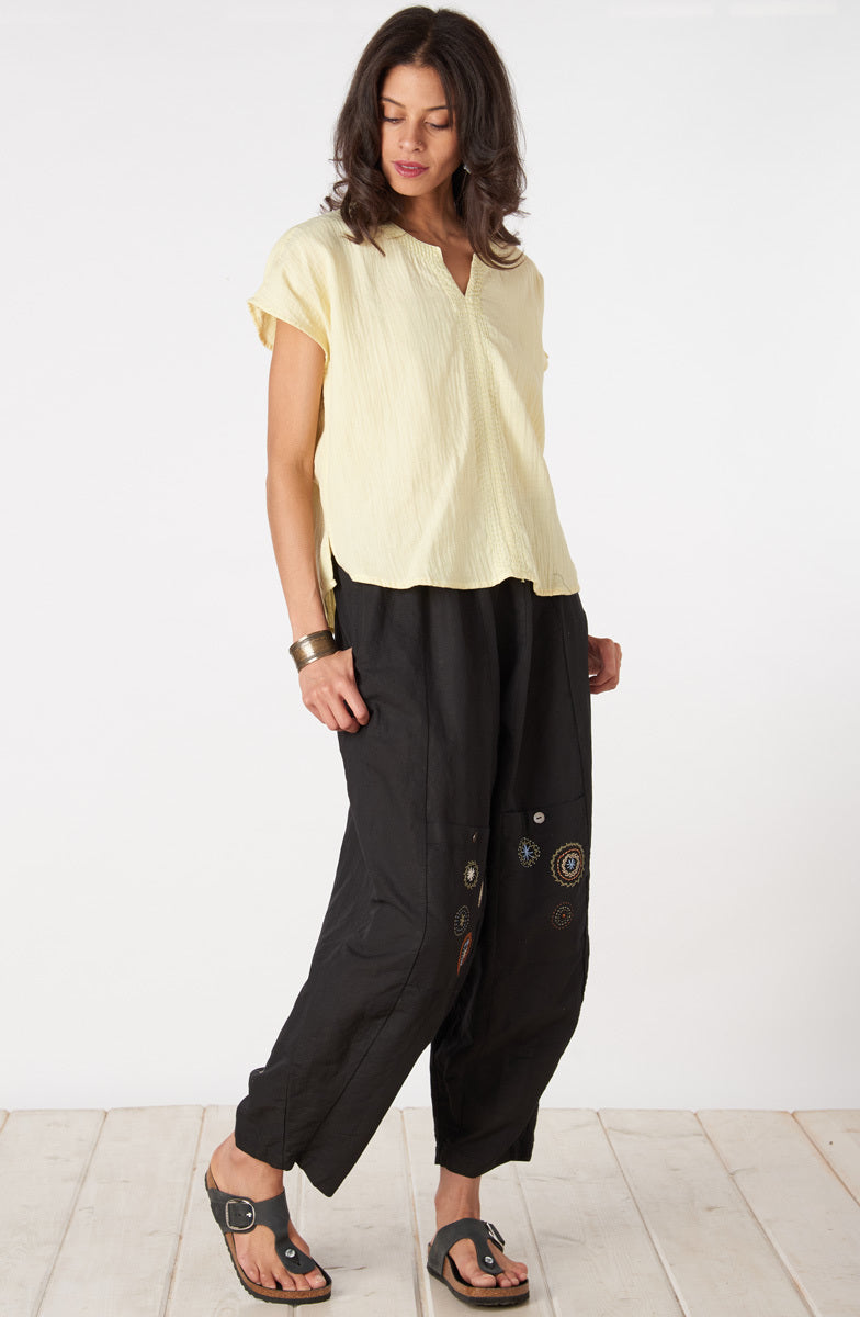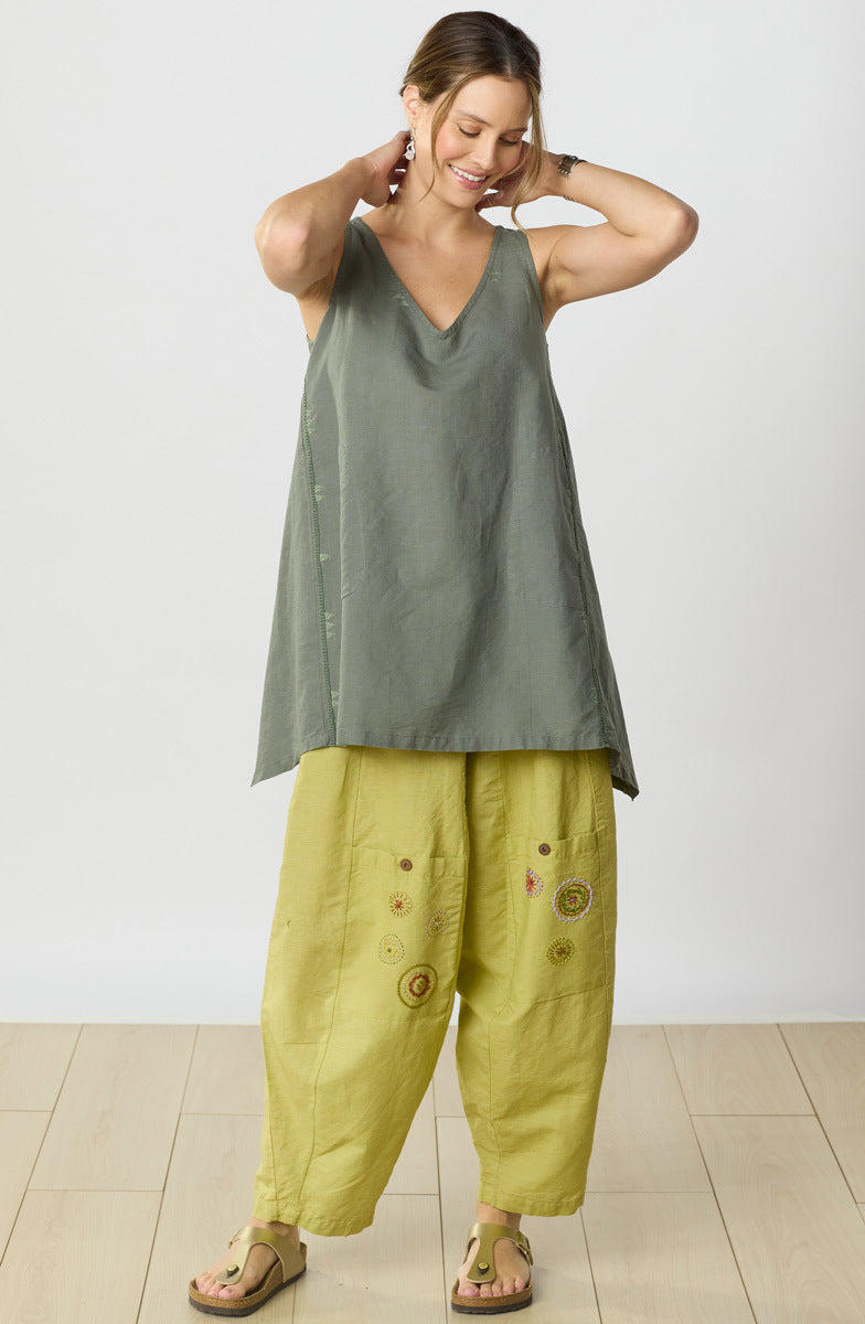 Your newest essential: a contemporary version of workers' field pants in a linen/cotton blend. Lantern-shaped leg and full elastic waist. Buttoned cargo pockets feature contrast hand embroidery. Generously cut.