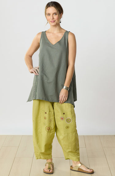 Your newest essential: a contemporary version of workers' field pants in a linen/cotton blend. Lantern-shaped leg and full elastic waist. Buttoned cargo pockets feature contrast hand embroidery. Generously cut.