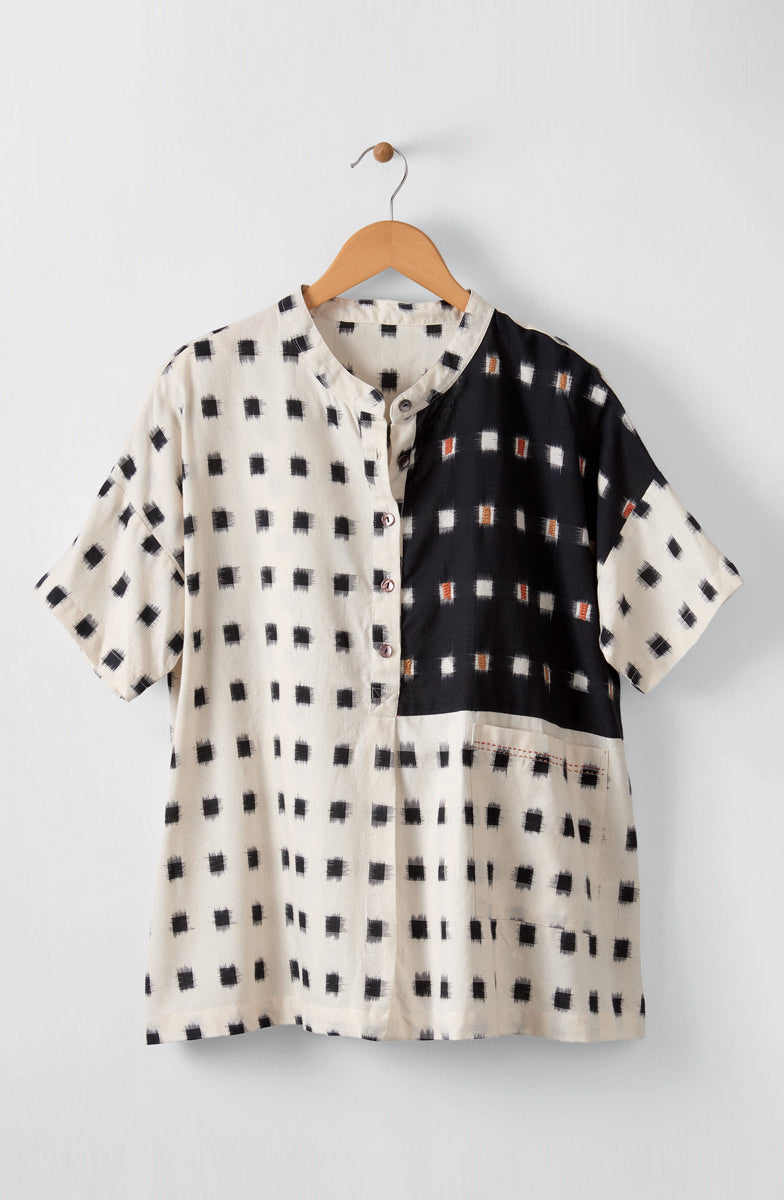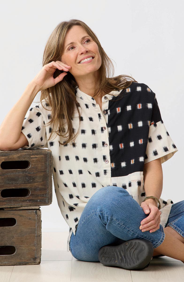 A go-anywhere favorite you’ll reach for again and again. Crafted in striking black-and-white double ikat, it features a contrast front panel and pocket for added interest. Dropped shoulders with contrast sleeves lend an easy, relaxed feel, while side slits ensure effortless movement. Hand-embroidered accents. Generously cut - size down for a less oversized fit.
