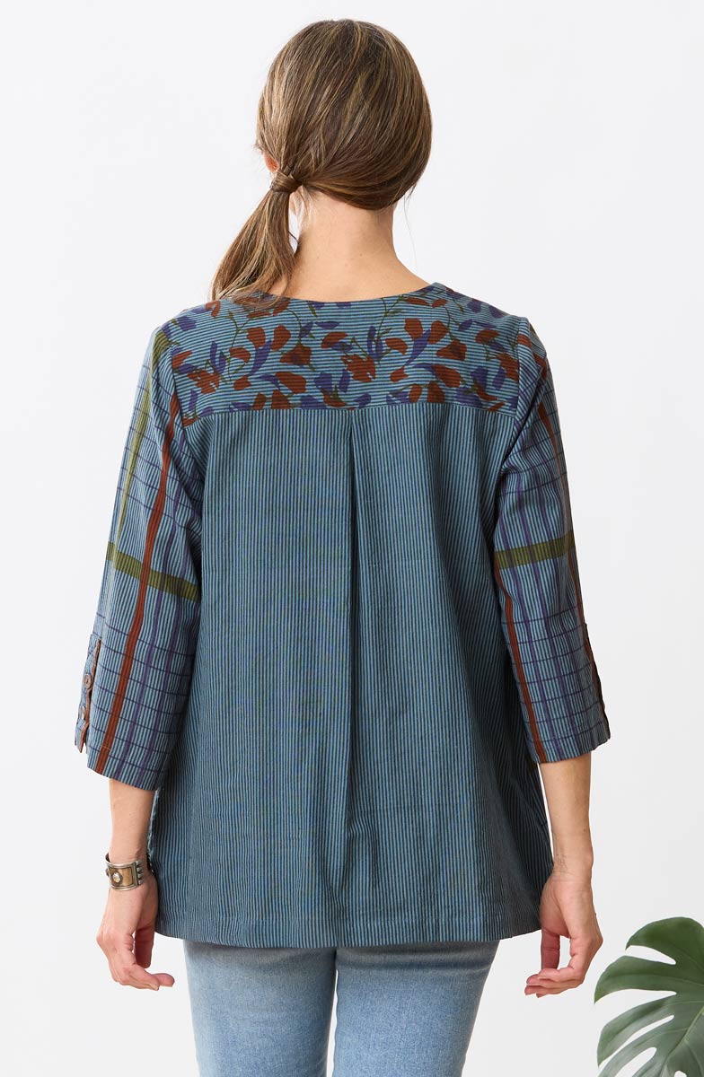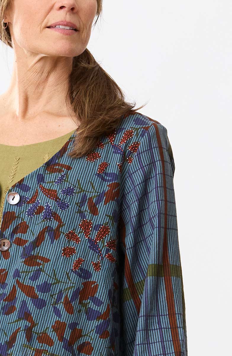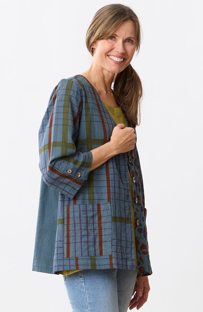 A striking collage of handprinted and hand-dyed woven stripes makes this a versatile and eye-catching layering piece. V-neck with elbow-length sleeves and button detail.