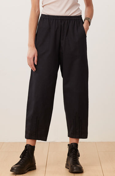 Medium-weight twill flood-length pant with flattering barrel-leg in a goes-with-everything color. Elastic waist. Tonal embroidery accents at hem.
