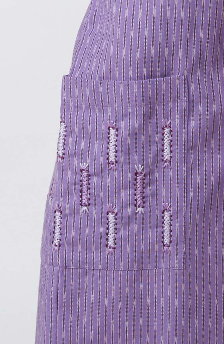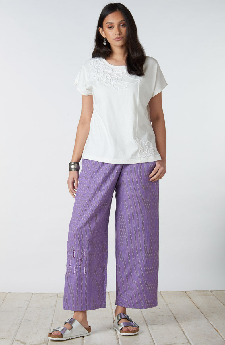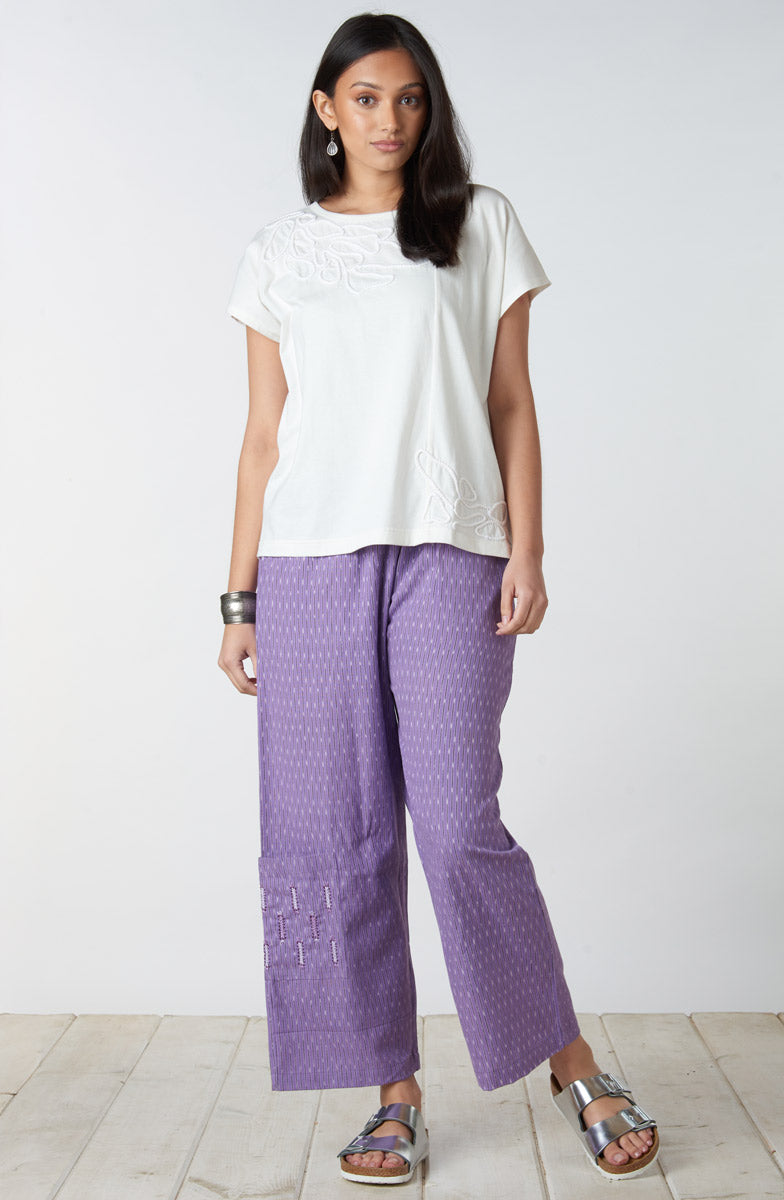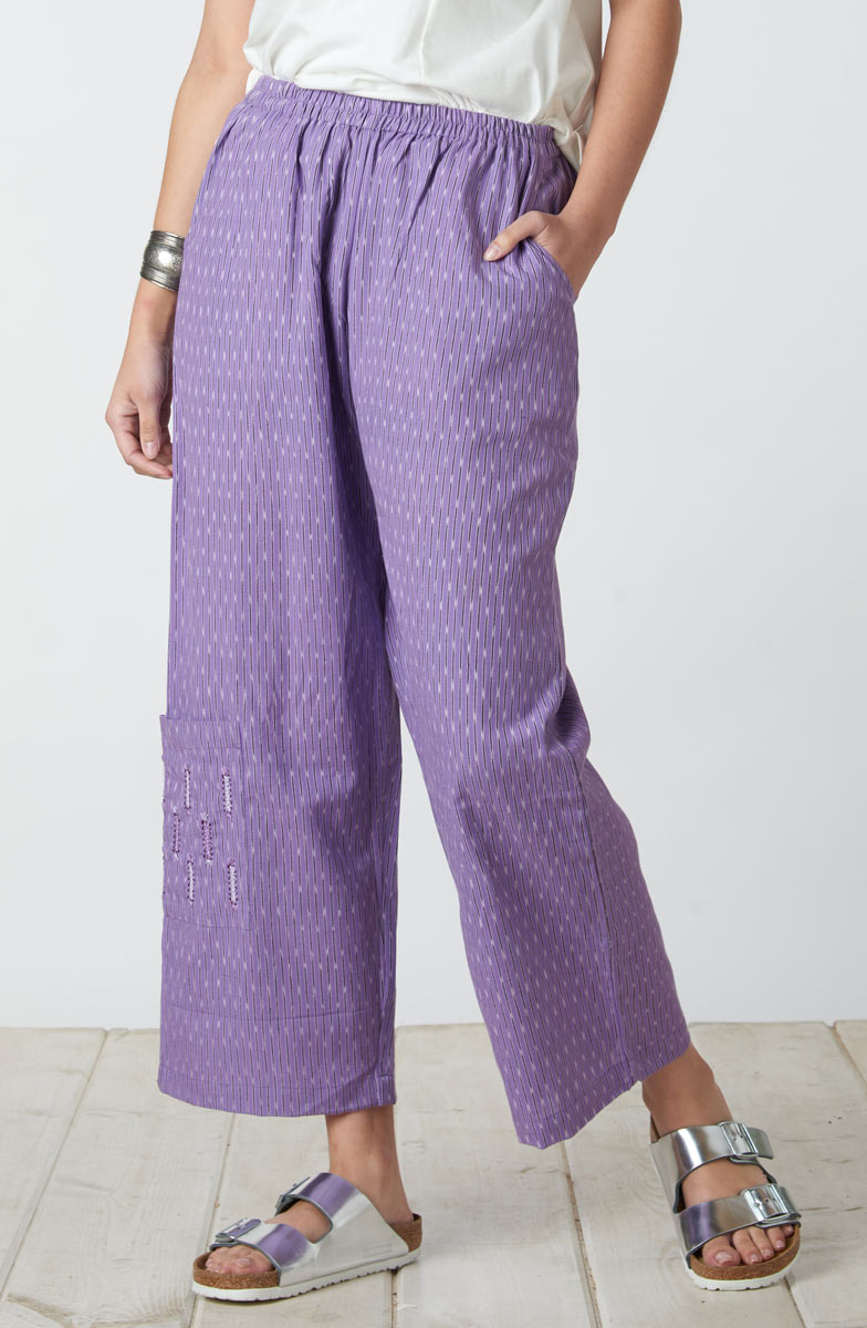 Our signature straight-leg cargo pant in light purple ikat. A pull-on, flood-length silhouette that sits at the natural waist with an easy fit through the hip and thigh. Hand embroidery adds a refined accent at the cargo pocket.