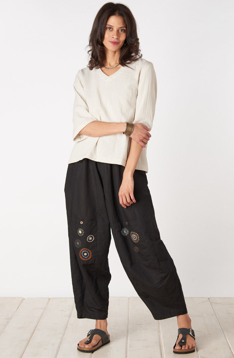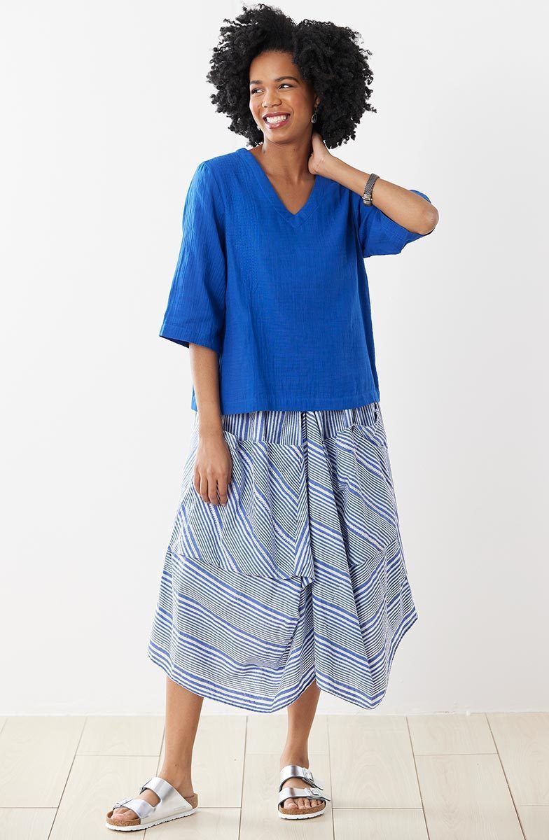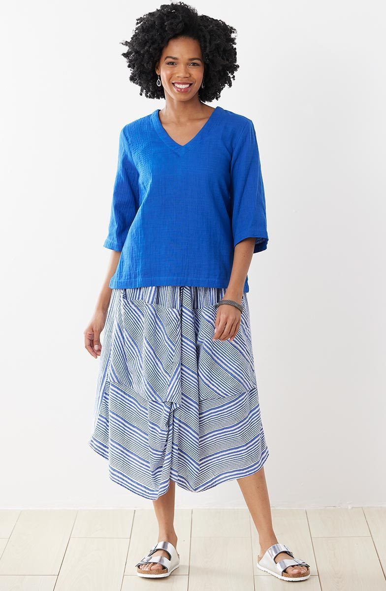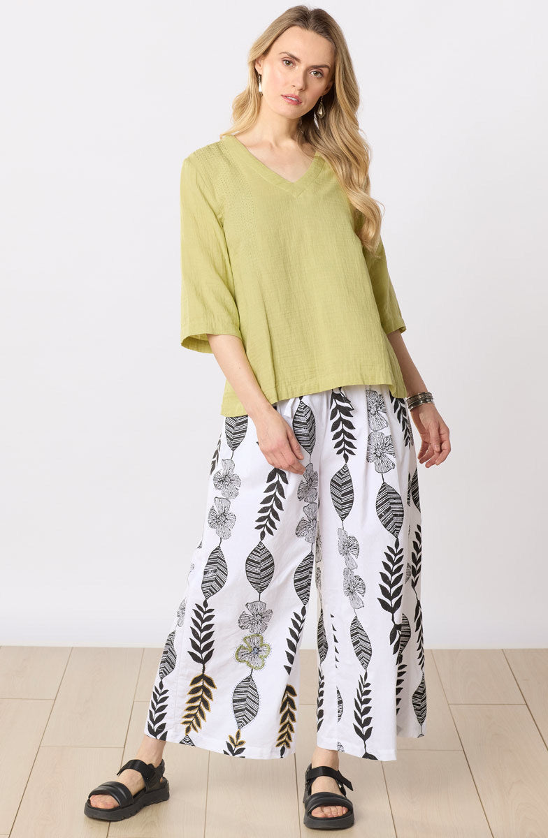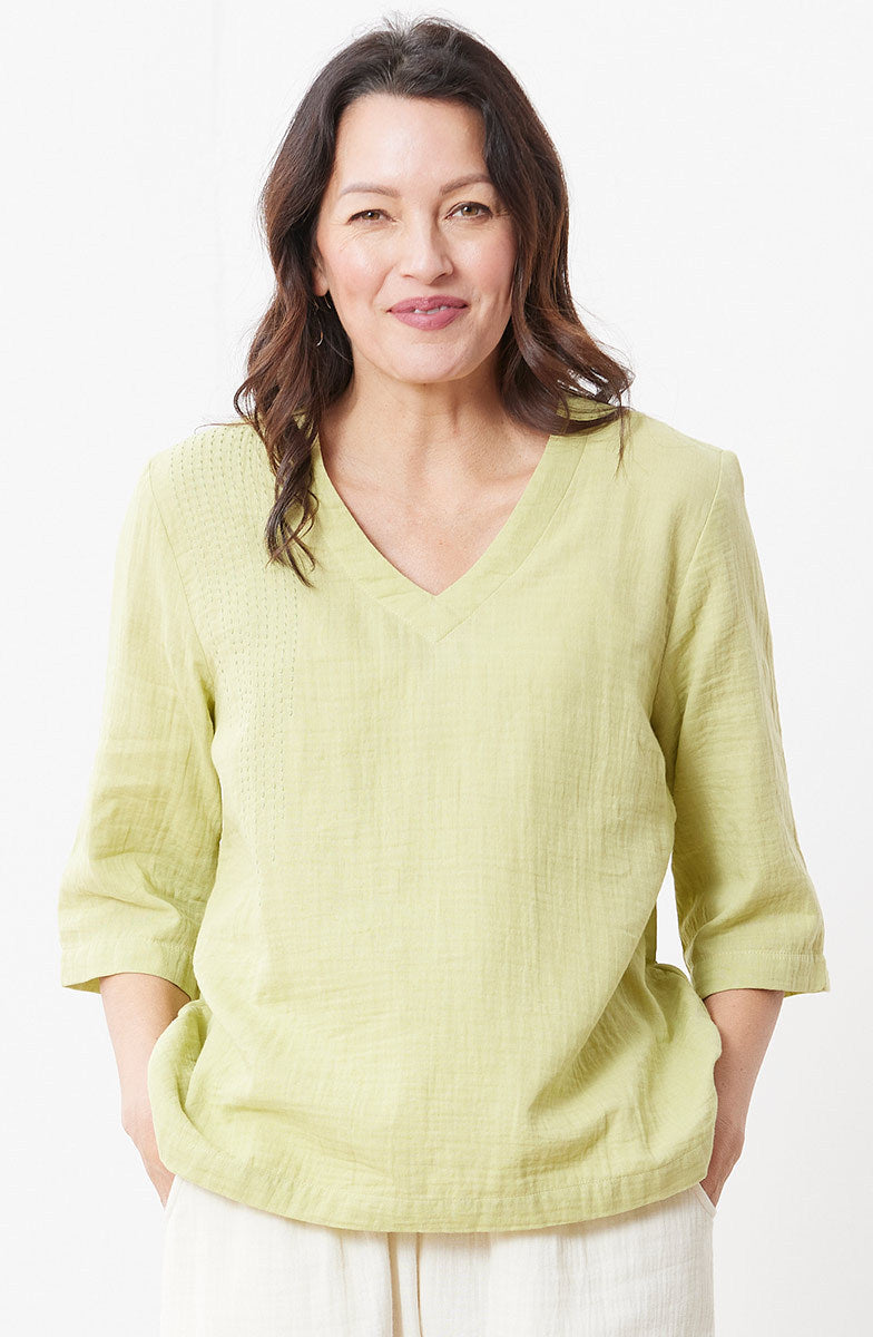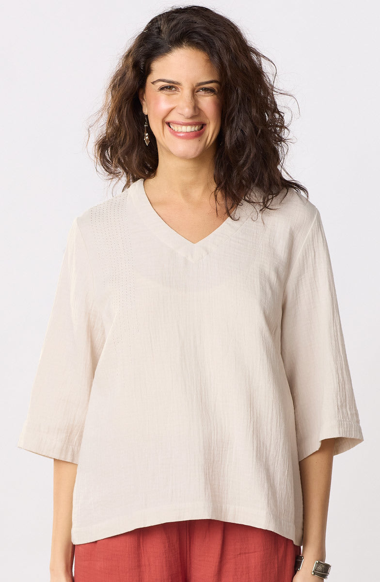 Soft and drapey, this double gauze top with a V-neck will become your new favorite. Tone-on-tone embroidery accents the shoulder.