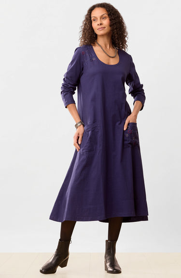 All the things you love about the MarketPlace favorite A-line jersey dress, plus long sleeves! Your basic dress is ready to wear everywhere with everything all year round. Tonal hand embroidery accents the shoulder and front pocket.