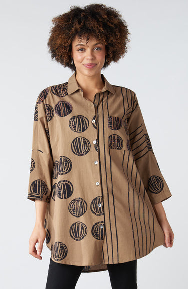 Our MarketPlace favorite big shirt in soft sandy brown with black blockprints. Dramatic dropped shoulders and tapered three-quarter length sleeves. Shirttail hem is slightly longer in the back. Hand embroidery embellishes the pocket and the shoulder. Generously cut - consider sizing down for a less oversized look.