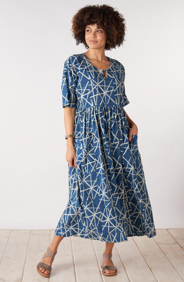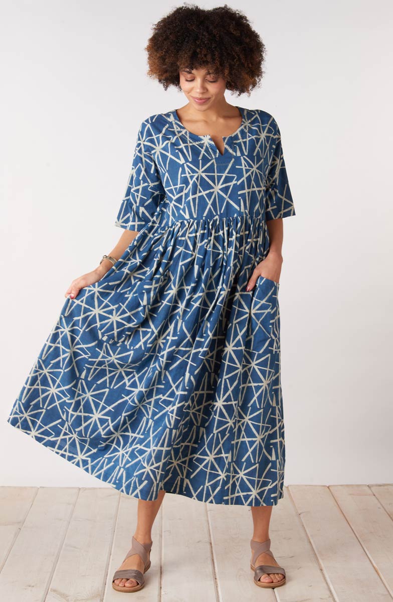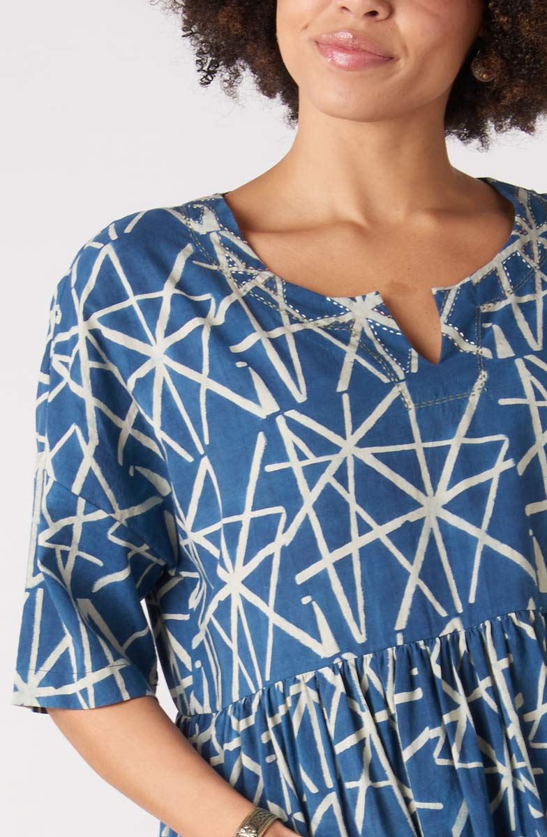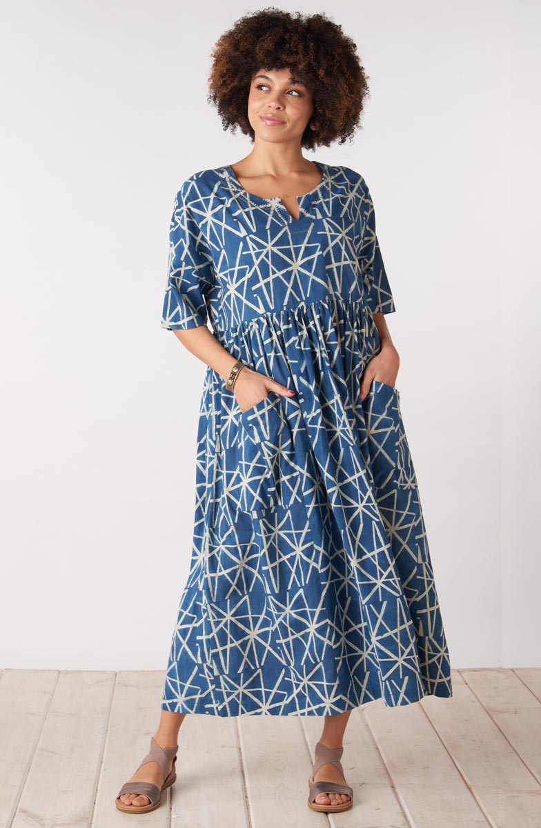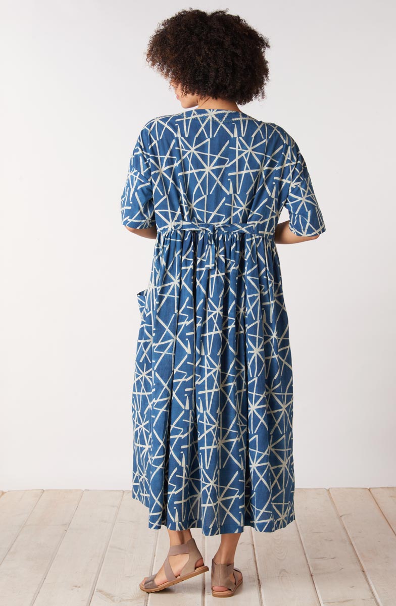 Slip it on and you're ready to go. Crafted from a soft resist hand print using natural dyes, this dress feels as comfortable as it looks. Dropped shoulders and elbow-length sleeves create an easy silhouette, while the generous fit and adjustable back tab ties let you customize it to your preferred shape.