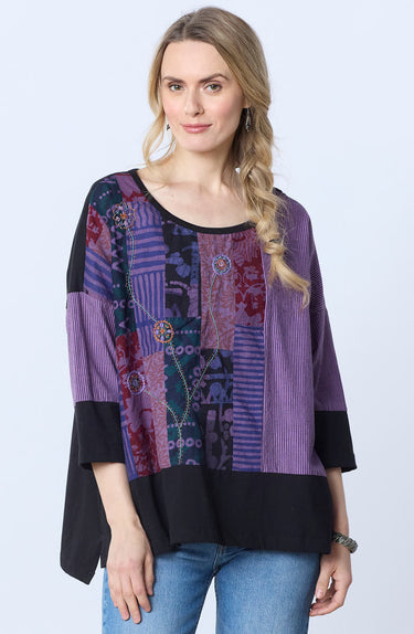 Mixed media popover top combines upcycled Chindi patchwork with purple woven stripes and a solid black jersey back and cuffs. While the dominant color is purple, Chindi patchwork colors and patterns may vary due to the variety of upcycled fabrics. High-low hem, side slits. Three-quarter length sleeves. Generously cut consider sizing down for a less oversized look.