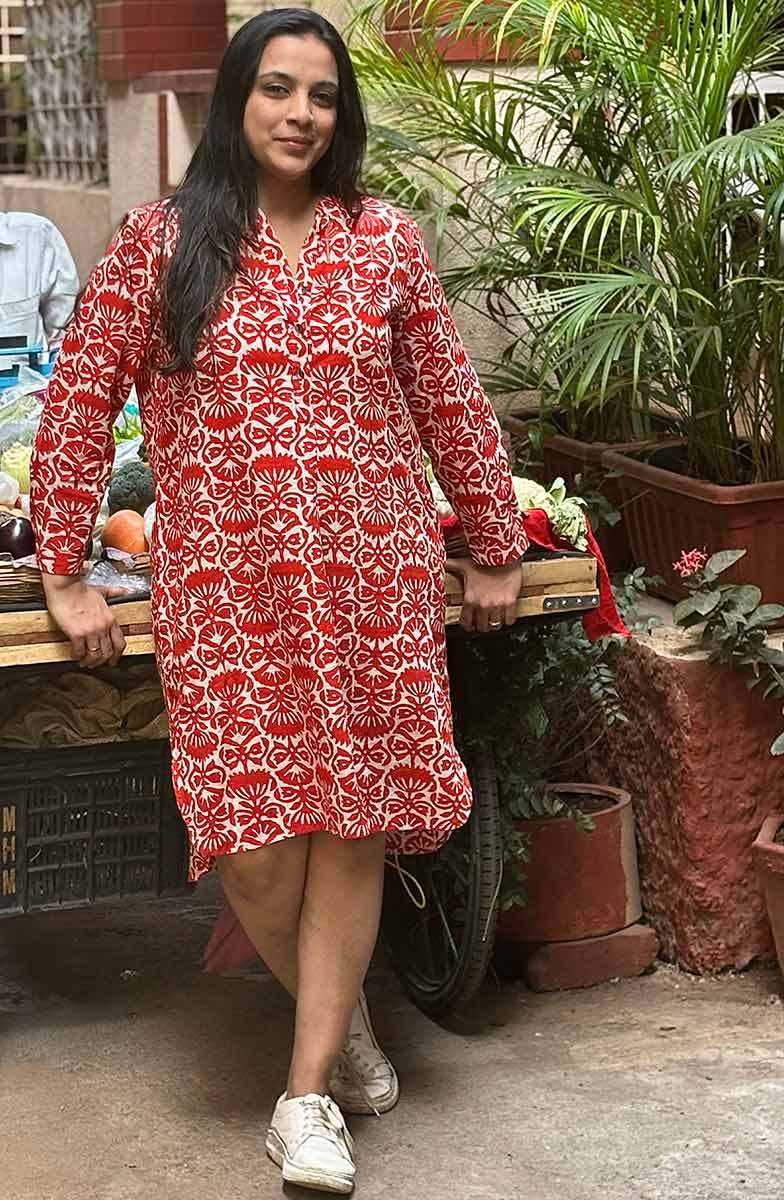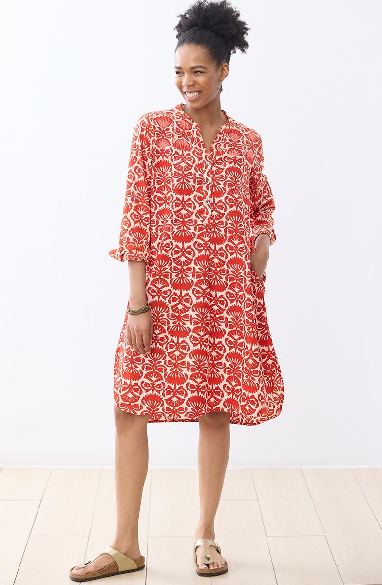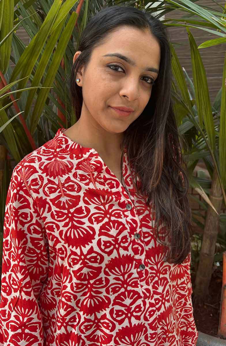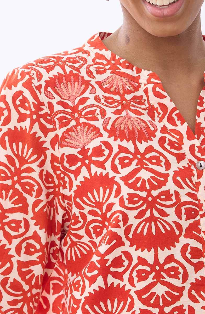 Long shirt blockprinted in rich red is ready to layer or to wear alone. The notch-neck tunic has a band collar with button placket and shirttail hem. Long sleeves with button cuffs. Hand embroidery accents the neckline.