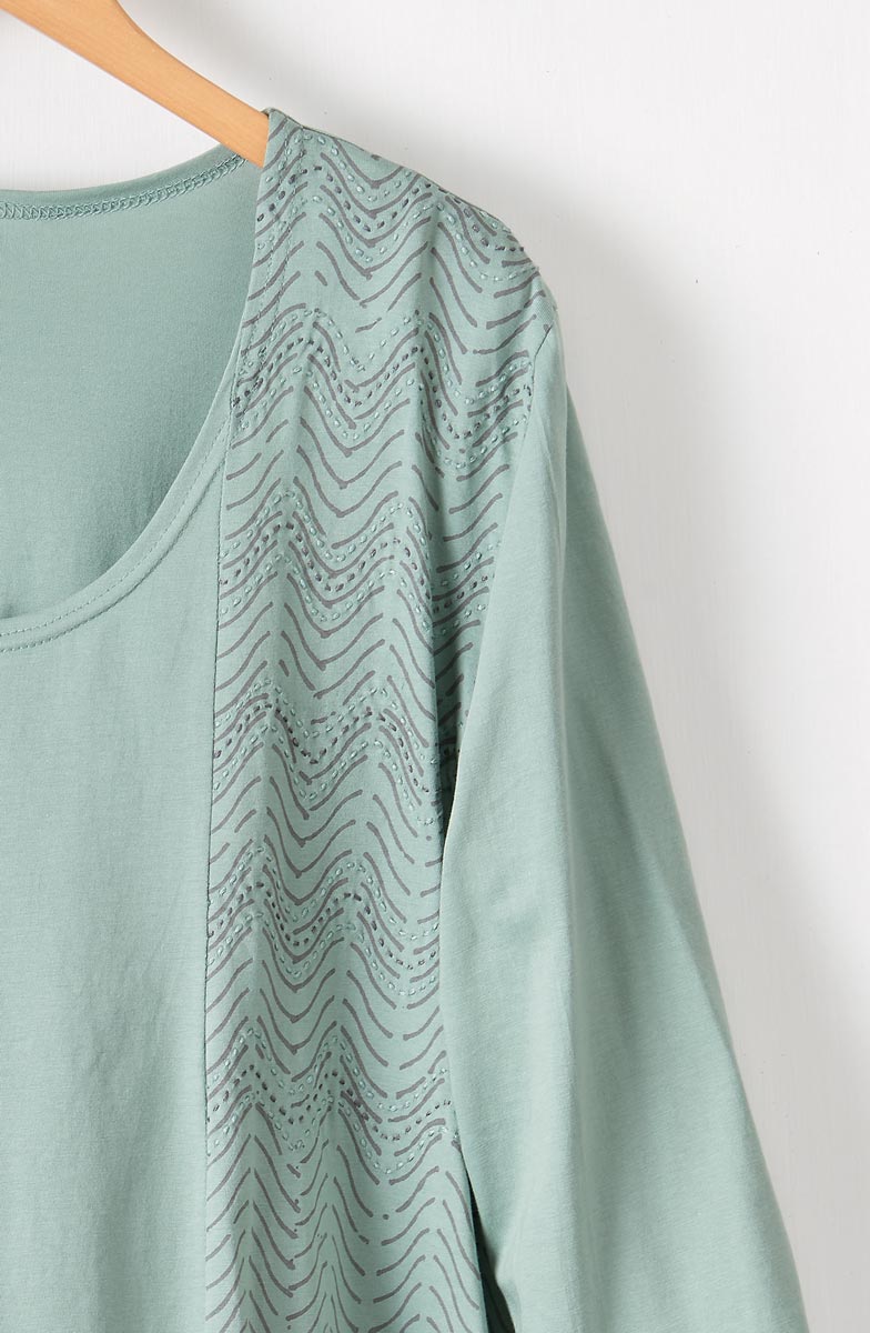 This isn't your average tee. Crafted in soft jersey with a flattering scoop neck, it features an embroidered hand-block print inset that adds artful dimension. Designed to move seamlessly from home to brunch to wherever the day takes you. Three-quarter length sleeves. Side slits.