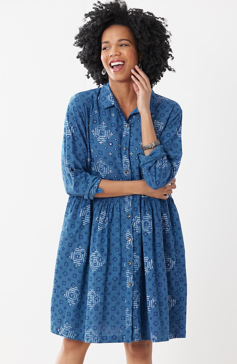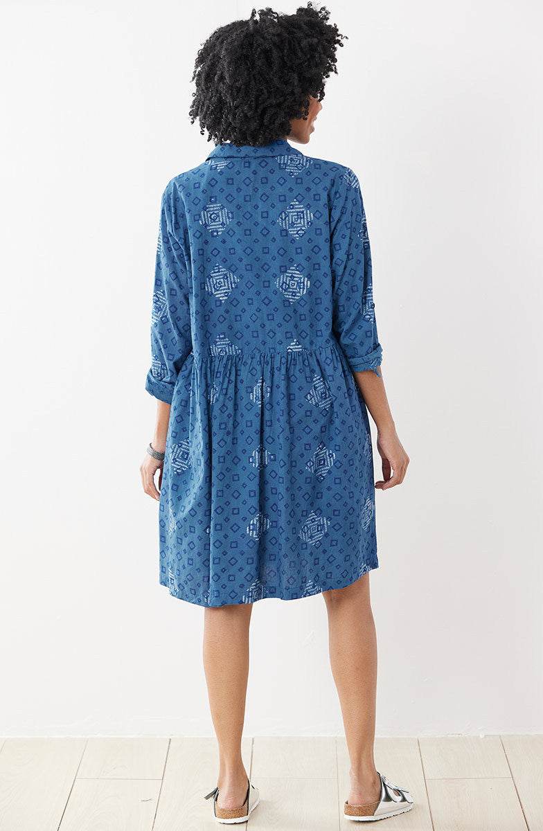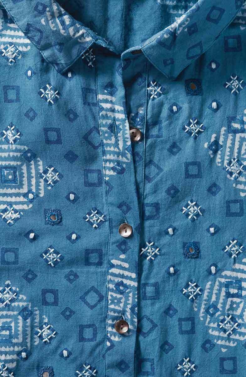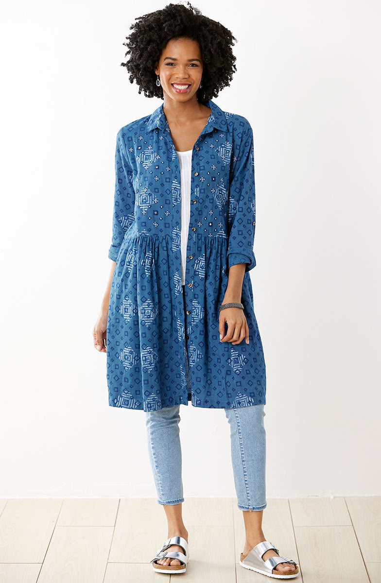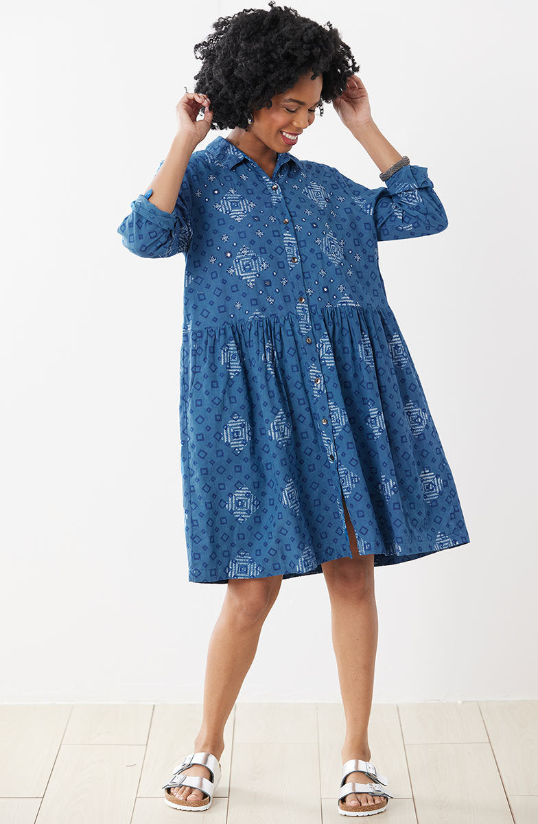 Our blockprinted dress in shades of blue sparkles with tiny mirrors inside the embroidered designs. With shoulders that are a little dropped, plus a drop-waist and soft gathers, it fits like a slightly oversized shirt  or wear it as a light jacket. Generously cut - consider sizing down for a less oversized look.