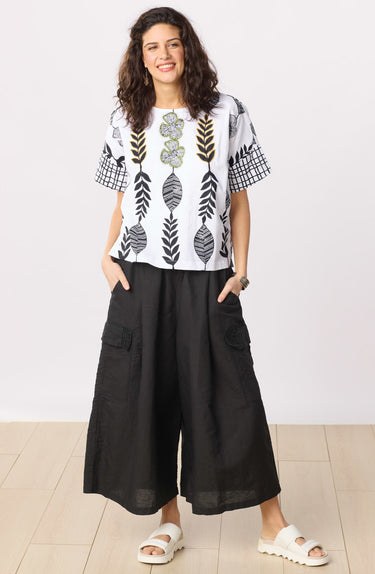Both pant and skirt, our linen/blend split-skirt style is ready for everyday or every adventure! The basic black pairs with any jacket, top, or tunic. Full elastic waist. Flapped cargo pockets have tonal hand embroidery.