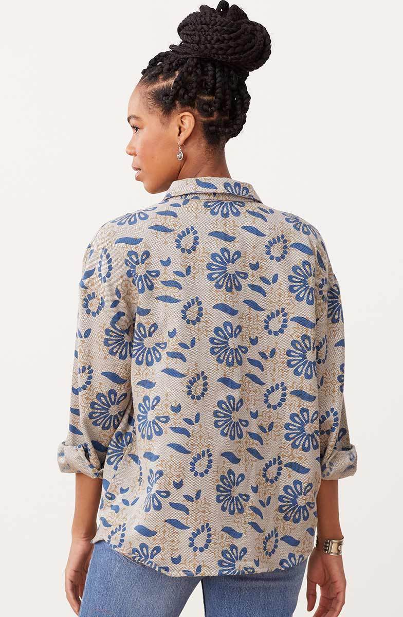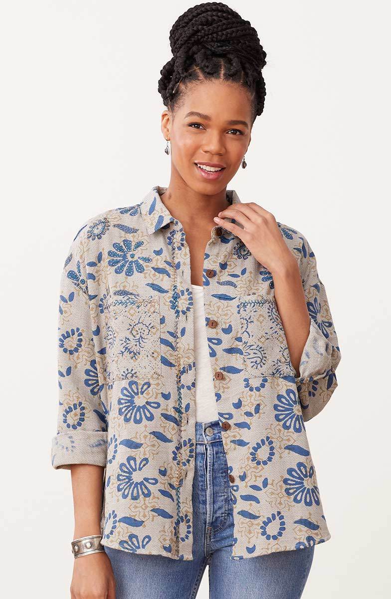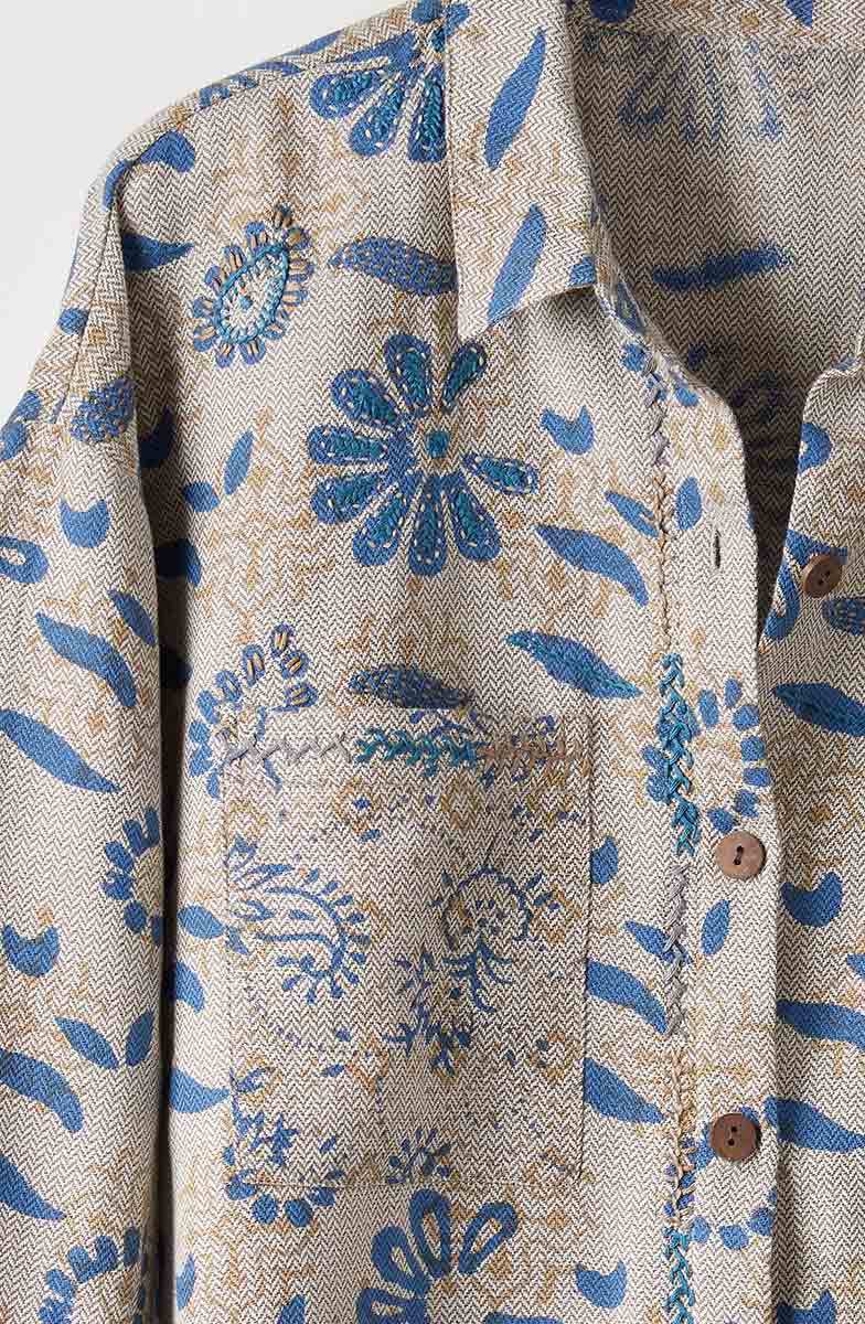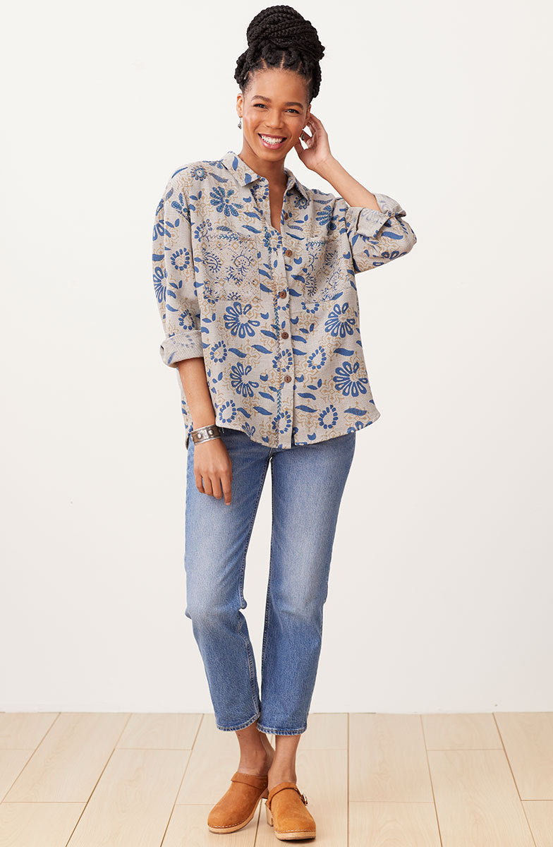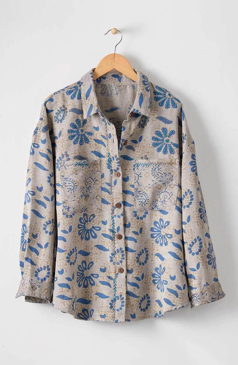 Fair Trade, Made by Ghar Udyog Collective Pretty and soft, but so durable; this utility shirt has it all. Bright blue block print on autumn-weight light grey herringbone weave. Shirttail hem, button cuffs. Hand embroidery embellishments on the shoulders and pockets.