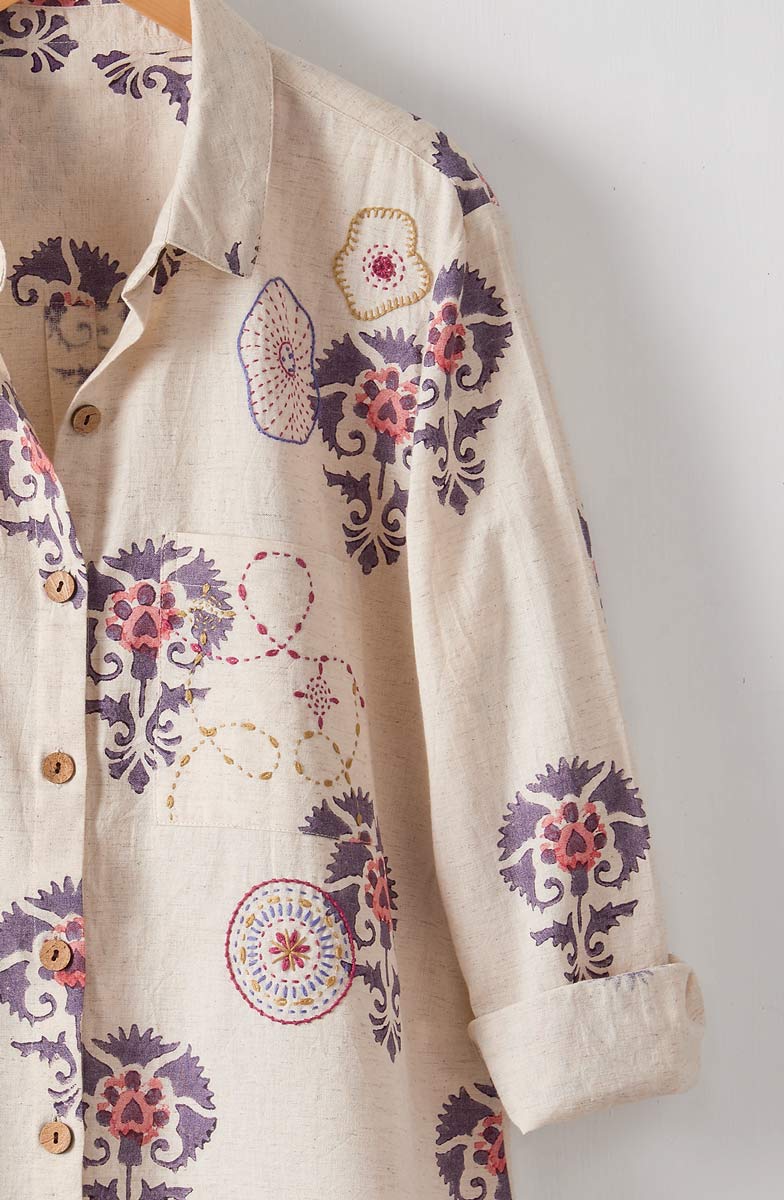 Slow fashion at its finest. This beautifully crafted oversized boyfriend shirt reflects exceptional attention to detail—from the handprinted purple and pink florals to the careful stitching and artistic hand embroidery. Made from cotton with a touch of linen, the fabric has a smooth, breathable feel. Designed with a softly curved hem, side slits, and long sleeves finished with button cuffs, it's an effortless piece you'll reach for again and again.