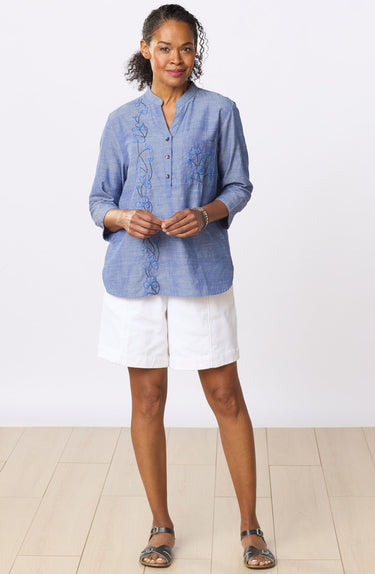 The MarketPlace handwoven eco-friendly recycled-yarn classic denim pant goes short! These medium-weight denim shorts are a pull-on style, sitting at the natural waist with an easy fit through the hip and thigh. Embroidered front seam detail. A durable and sustainable choice, hearty denim handwoven with recycled fibers blends strength and eco-consciousness. The handwoven texture adds a unique artisanal touch, while the incorporation of recycled materials reduces waste.