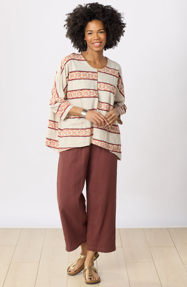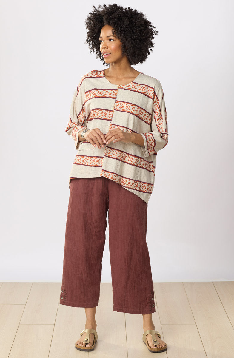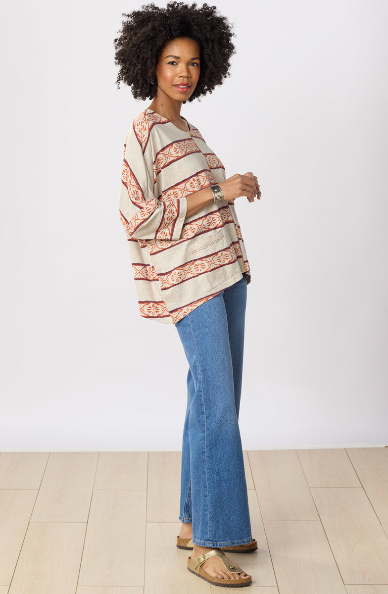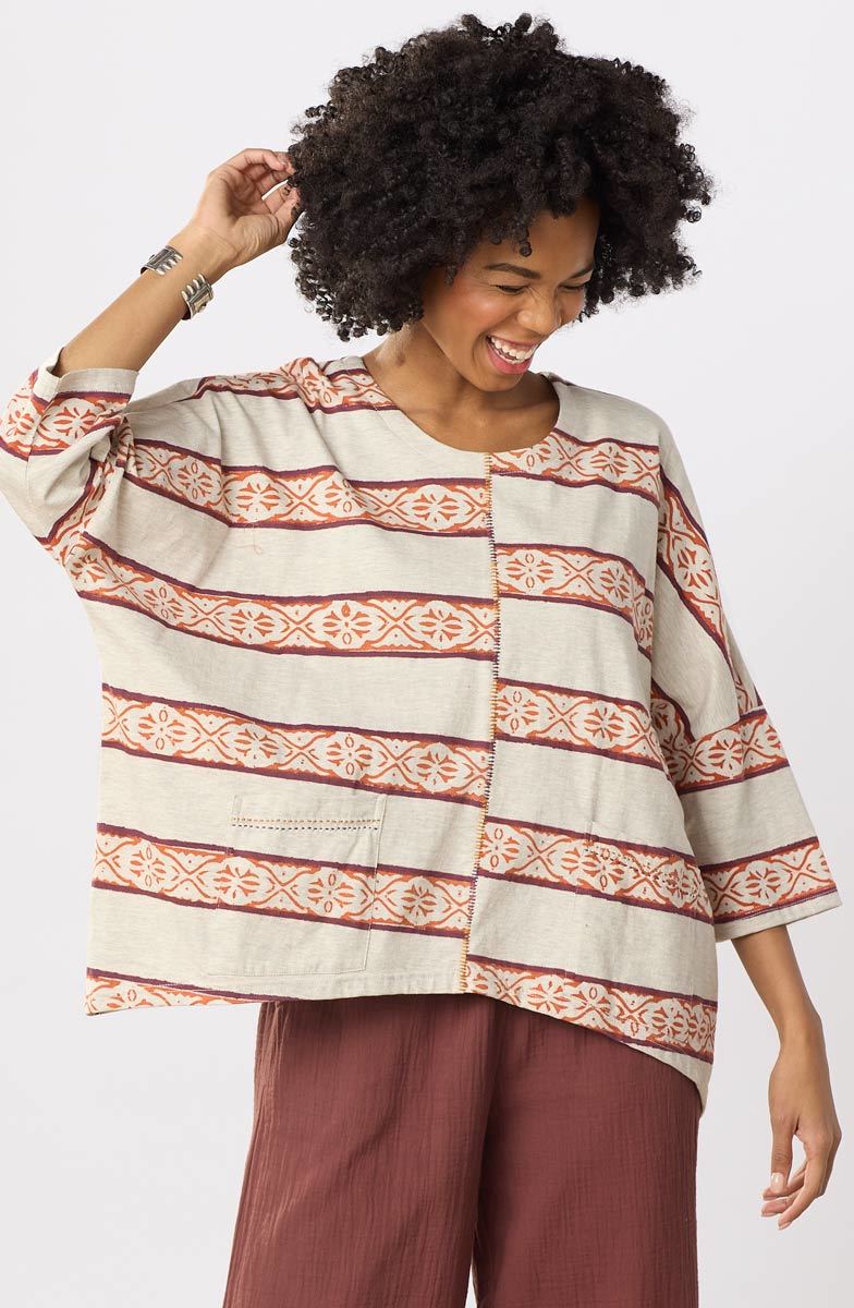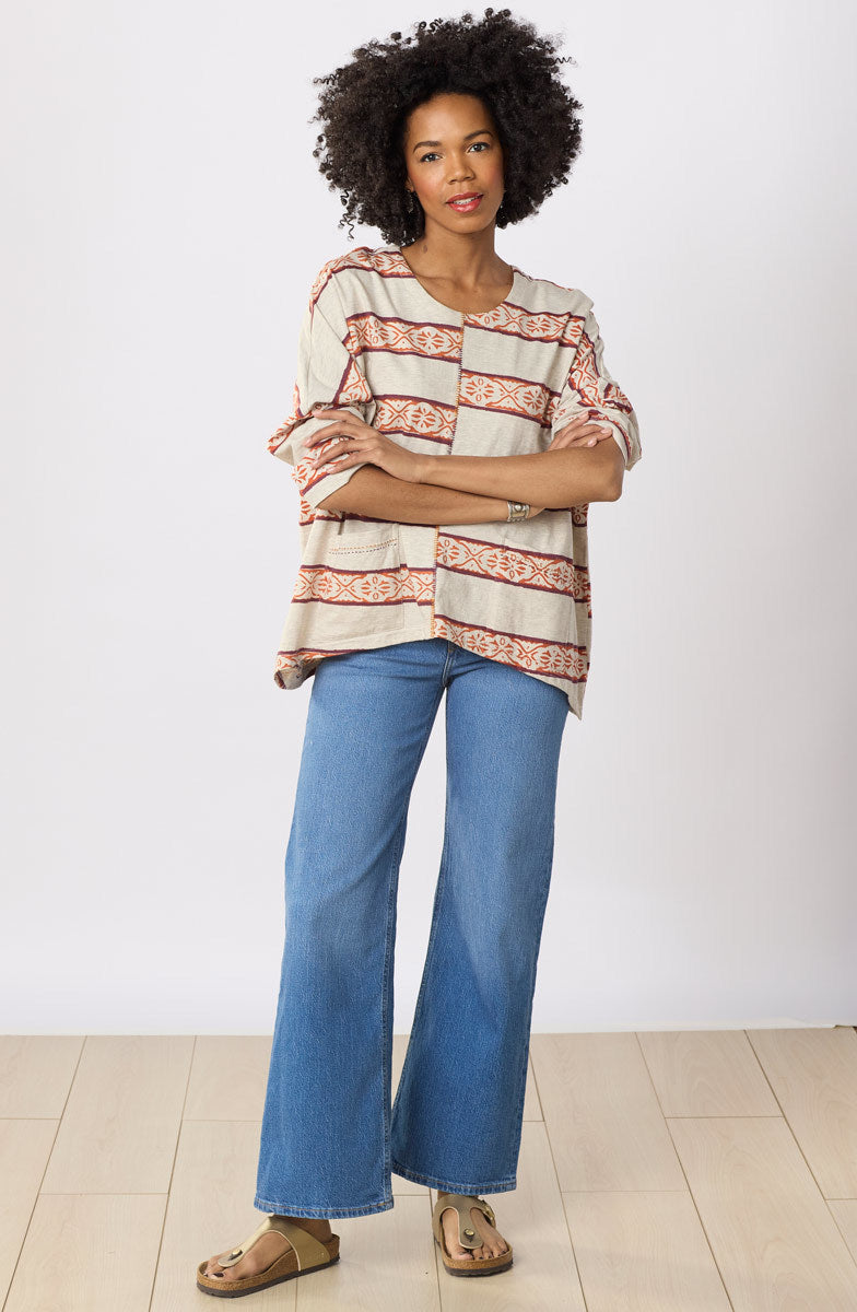 Pullover swing top with dolman bracelet sleeves in a soft natural-color jersey with rust and brown blockprints. Boxy knit shirt has handkerchief hem. Hand embroidered seam detail and pocket accents. Generously cut - consider sizing down for a less oversized look.