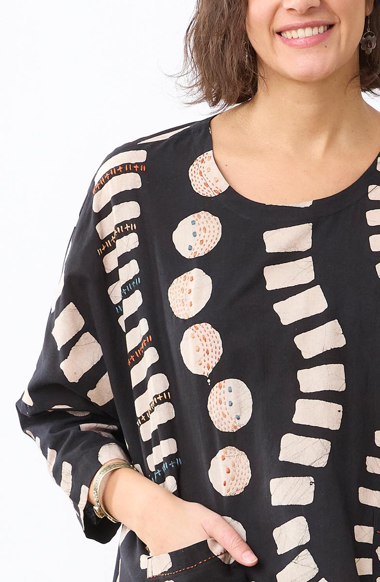 A bold, artful batik block print in black and natural gives this top its standout appeal. Designed as an easy pullover with relaxed dolman bracelet-length sleeves, it features front pockets and hand-embroidered accents for added dimension. Generously cut for an effortless fit—consider sizing down if you prefer a less oversized silhouette.