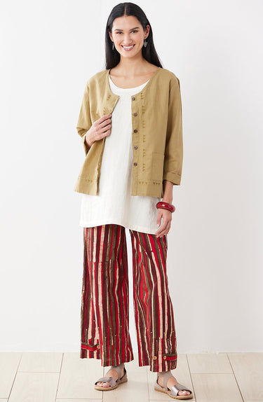 Our easy wide-leg pant in energetic red, natural, and green batik blockprinted stripes. Flat front with drawstring, elastic back. Button detail and hand embroidery accents at the hem.