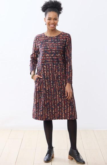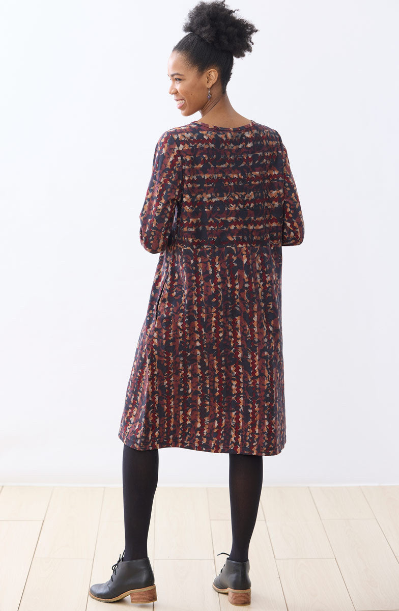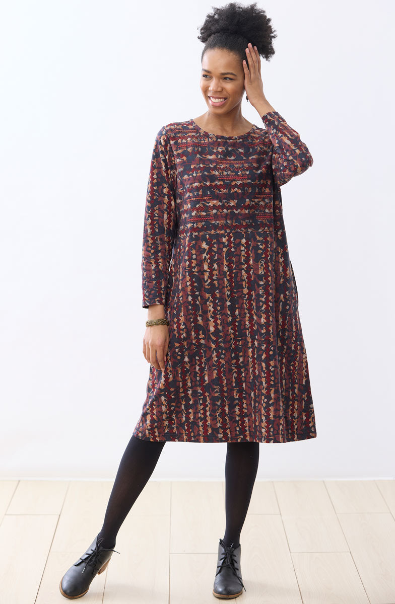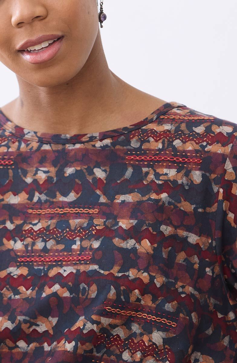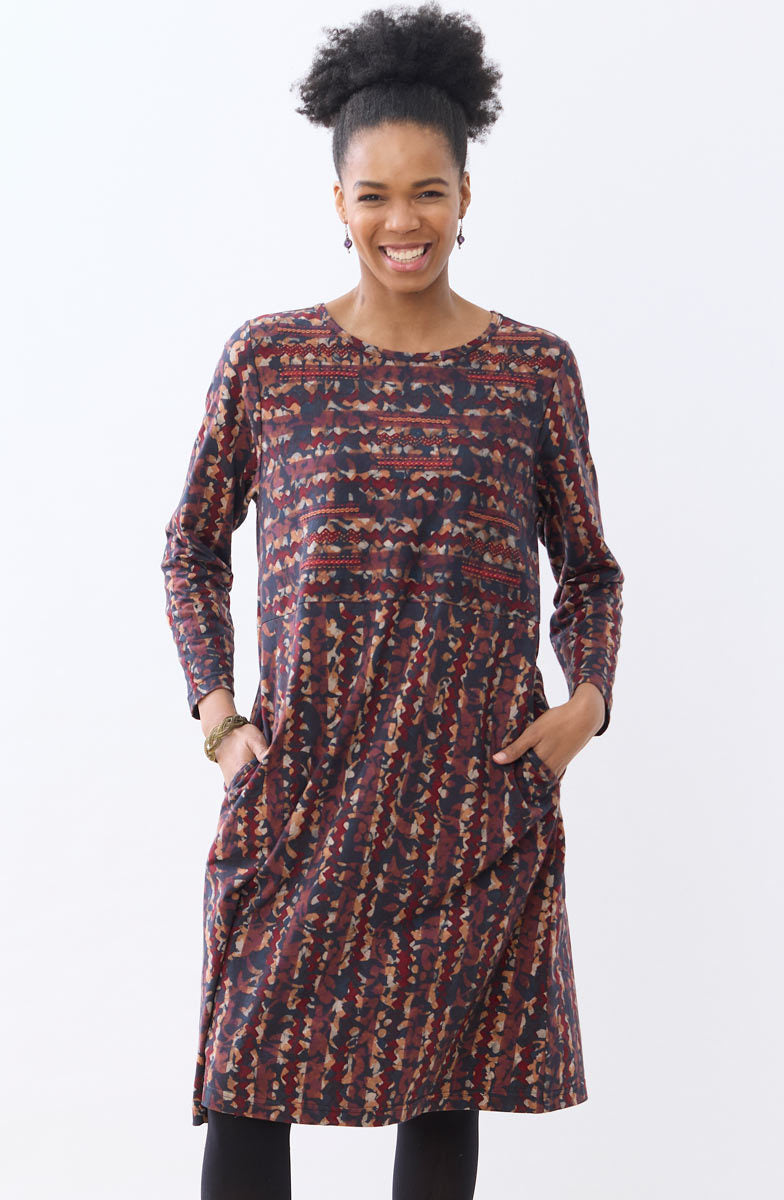 Rich colors and easy style. Intricate batik and block prints in autumn reds and browns complete the style of this easy pullover jersey dress. Hand embroidery highlights the bodice.