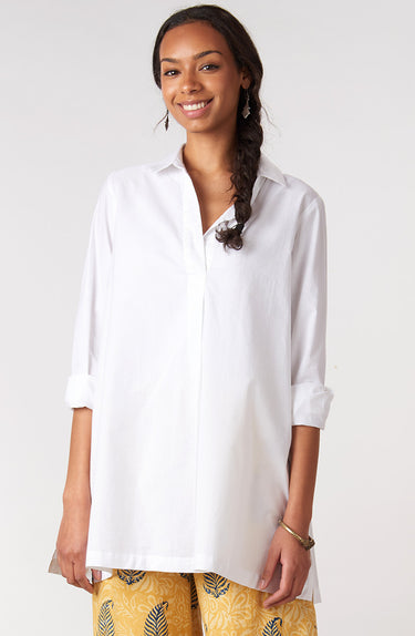 A style that works without even trying. Soft eco-friendly organic cotton shirt. Colors are Natural Dye. Tone-on-tone hand embroidery accents V-neck, center pleats front and back. Deep side slits give an easy sweep. Long sleeves with button cuffs.