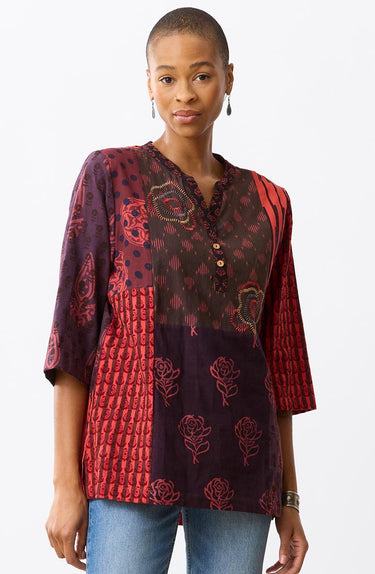 A shorter take on our beloved Shaily kaftan, this tunic shirt is a vibrant collage of deadstock and chindi handprints in red, orange, and black. A band collar with a V-neck and button placket adds easy structure, while side slits and three-quarter-length sleeves keep the fit relaxed and effortless. Hand embroidery accents lend an artisanal finish. Because of the varied upcycled fabrics, colors and patterns will differ—making each piece truly one of a kind. Generously cut; consider sizing down for a less oversized silhouette.