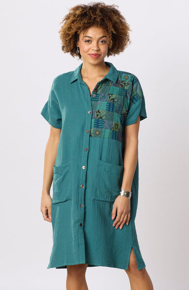 Versatile shirt dress you will want to wear everywhere. Soft and comfy blue-green double-gauze is paired with a hand embroidered upcycled chindi patchwork panel. Dropped shoulders with short sleeves. Side slits. While the dominant color is teal, chindi patchwork colors and patterns may vary due to the variety of upcycled fabrics.
