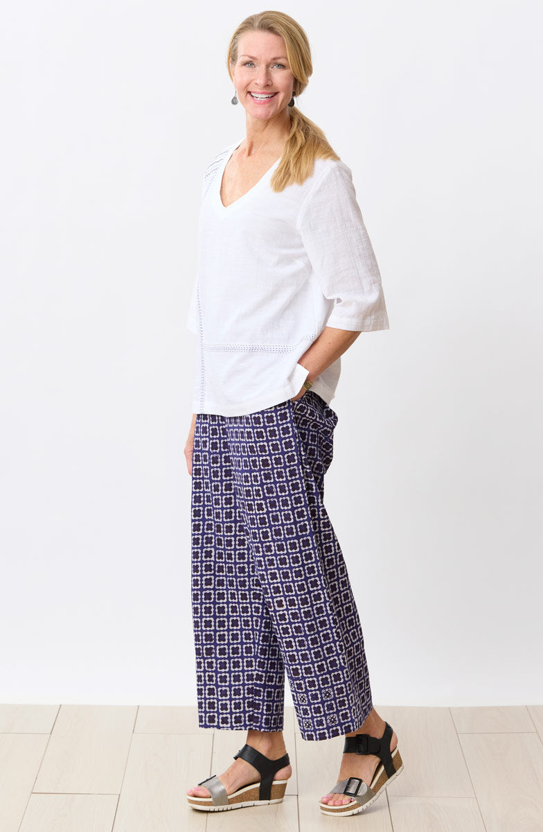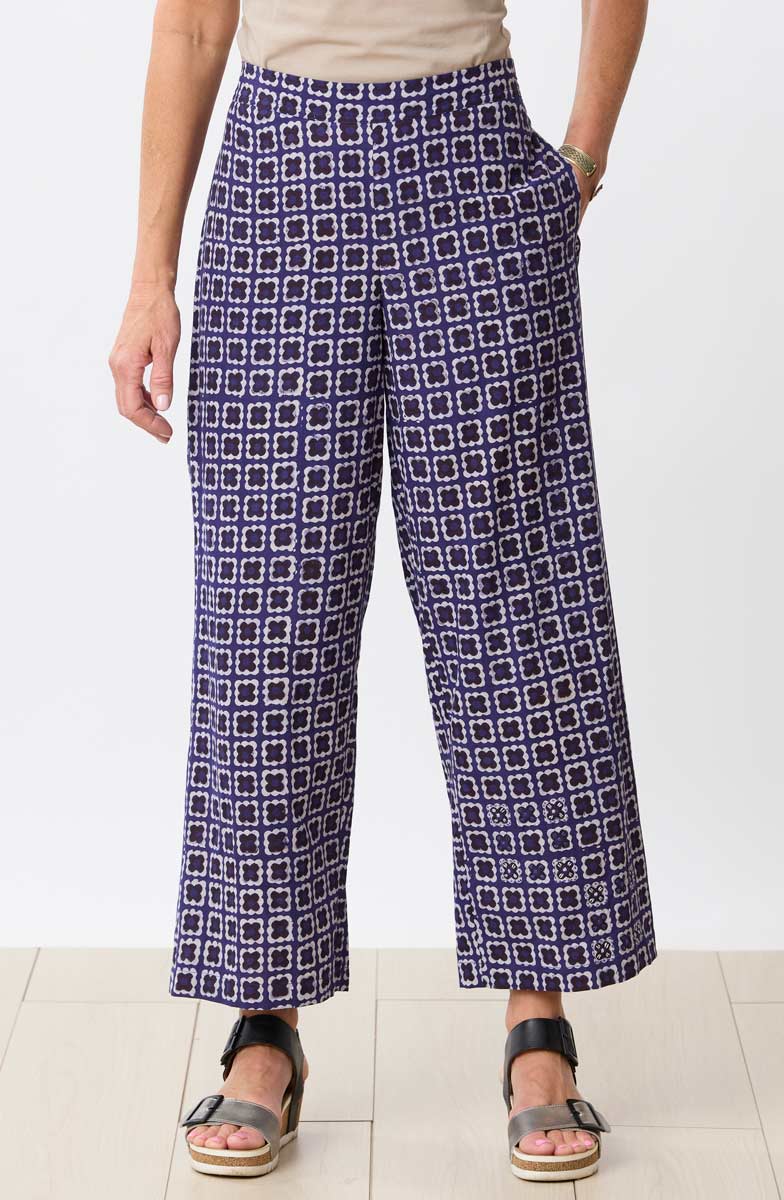 An easy wide-leg pull-on pant in deep purple and natural resist block print. Designed with a flat front and elastic back for a smooth, modern fit. The soft color palette and geometric pattern offer a fresh alternative to denim. Finished with pockets and subtle hand embroidery accents.