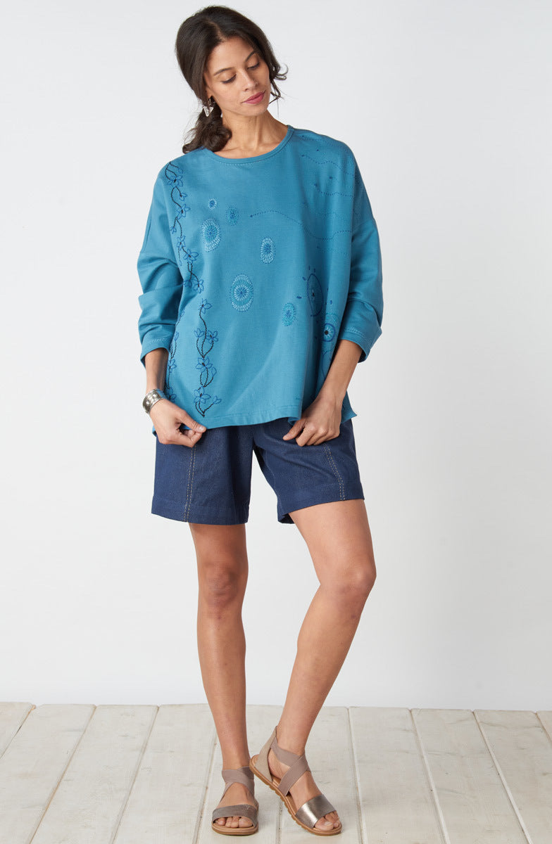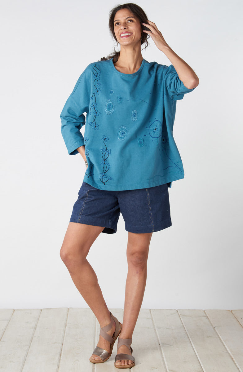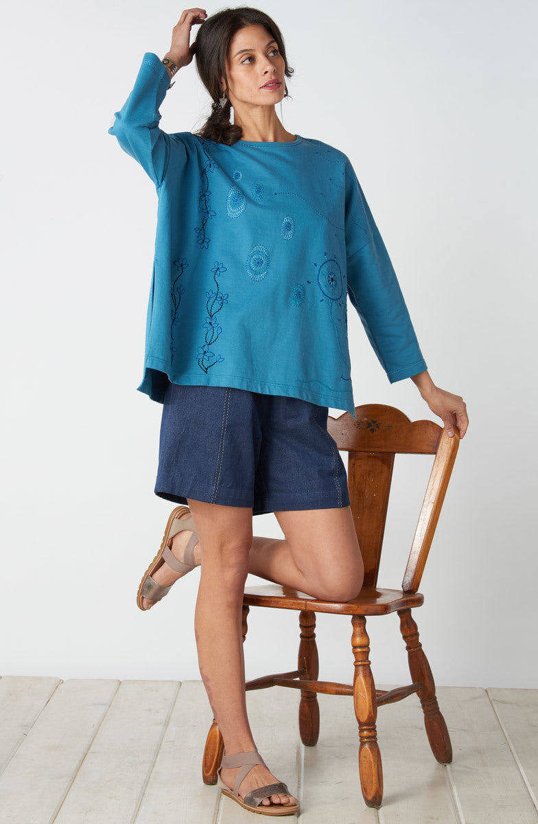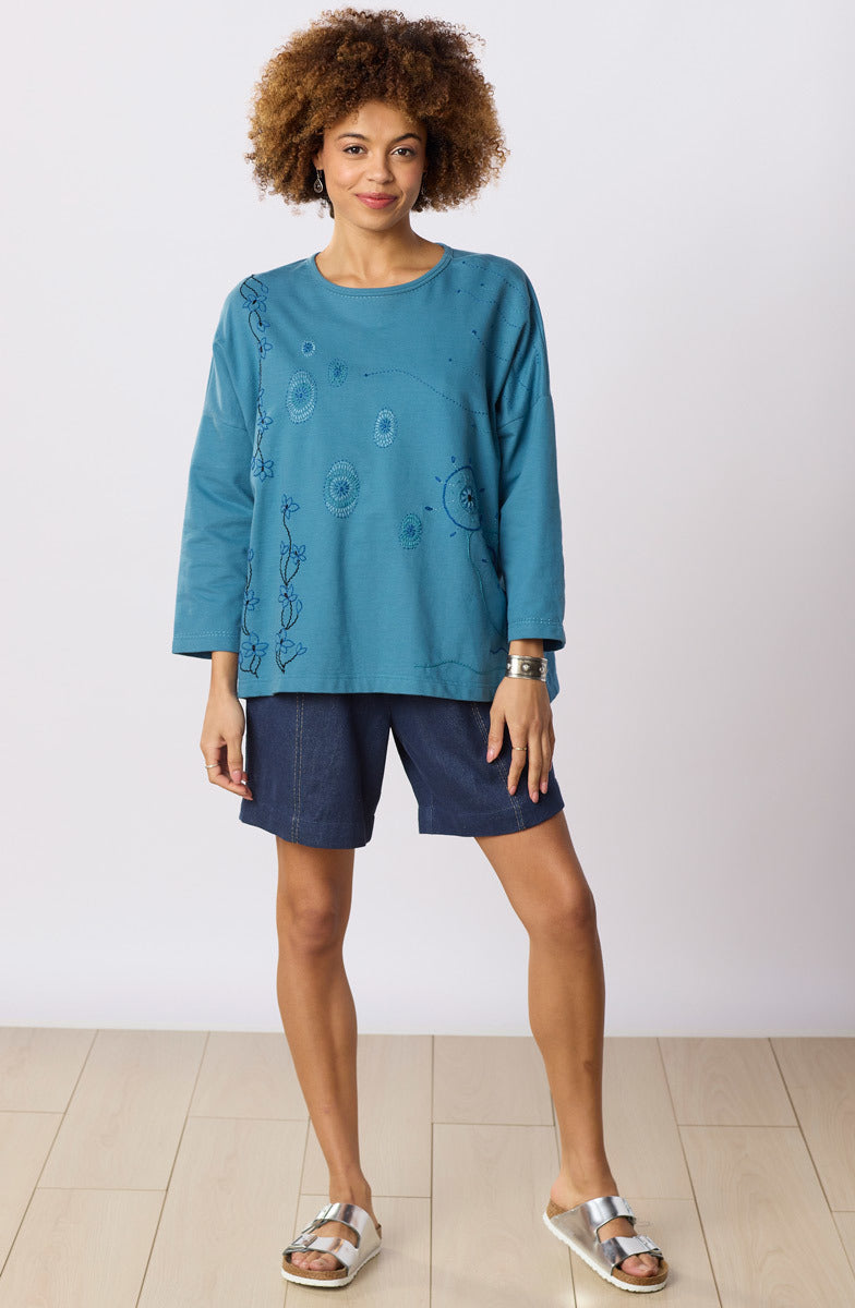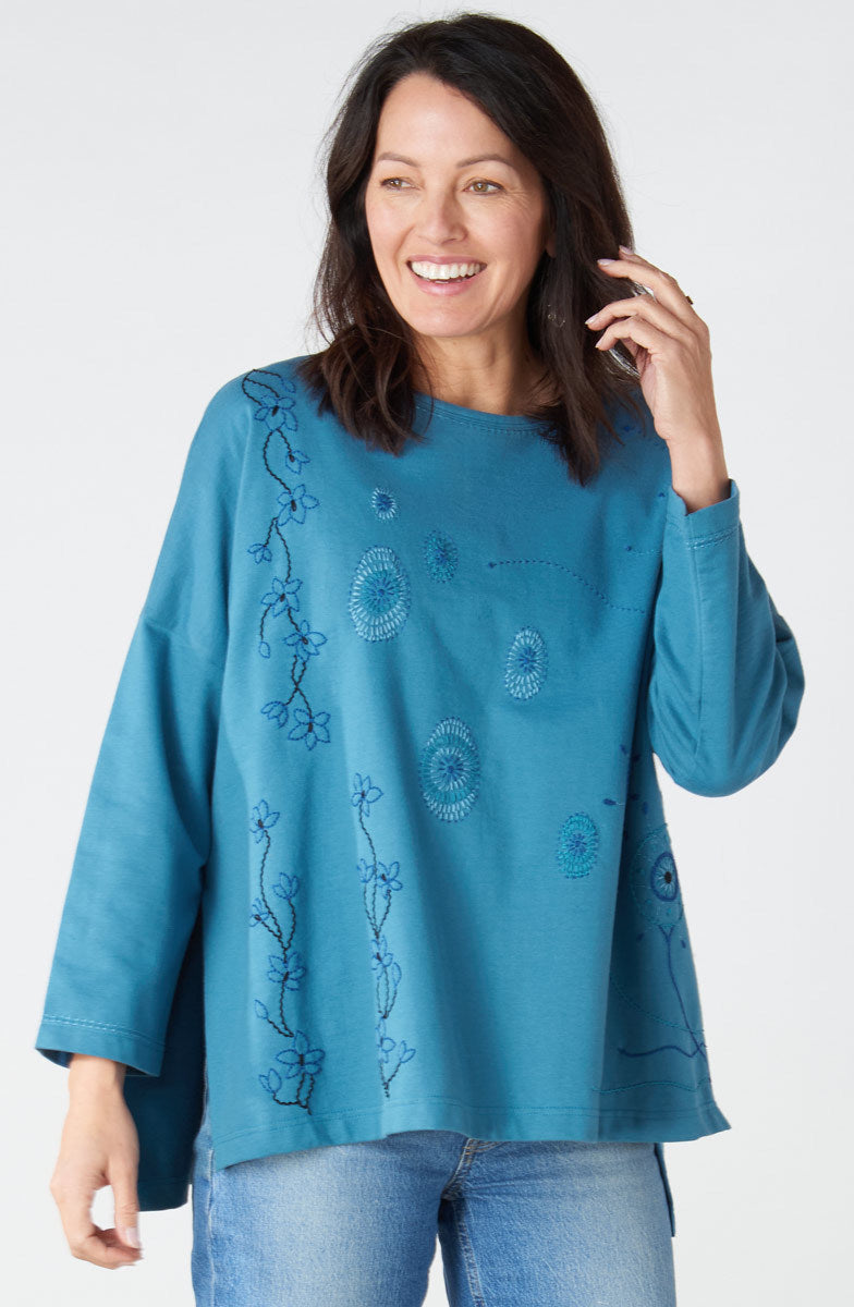 Intricate embroidery expertise dresses up this soft organic French terry knit sweatshirt with dropped shoulders and a high-low hem. Deep side slits. Generously-sized in dark teal blue is ready to wear alone or layered. Consider sizing down for a less oversized look.