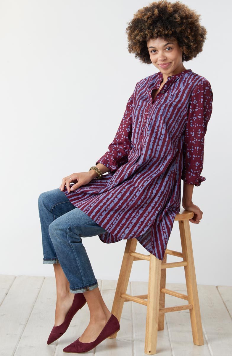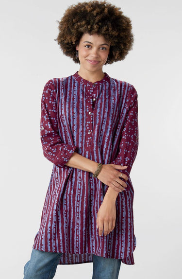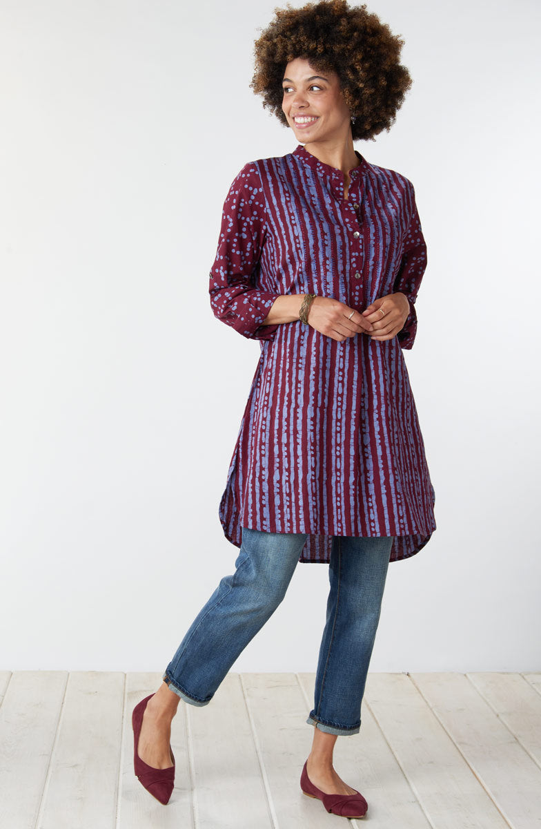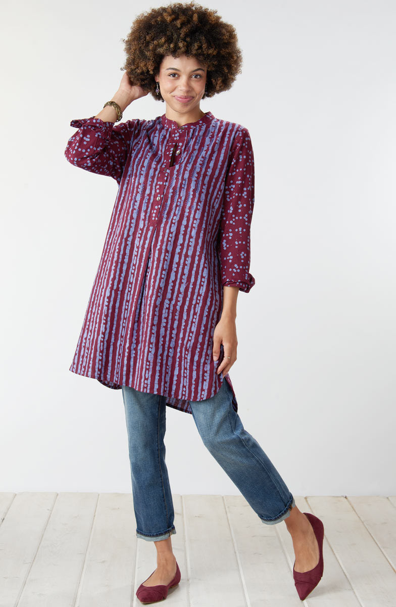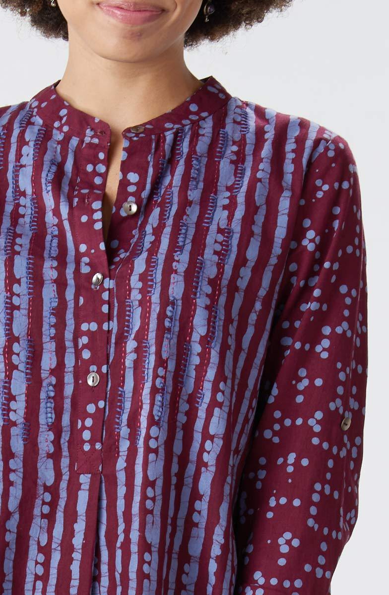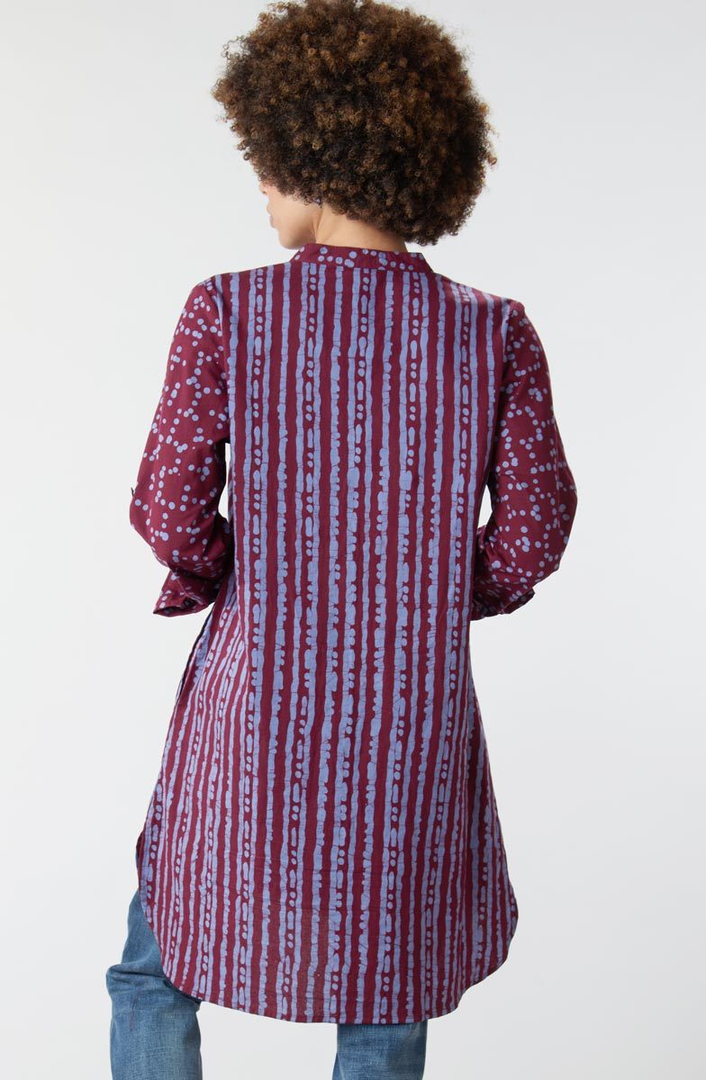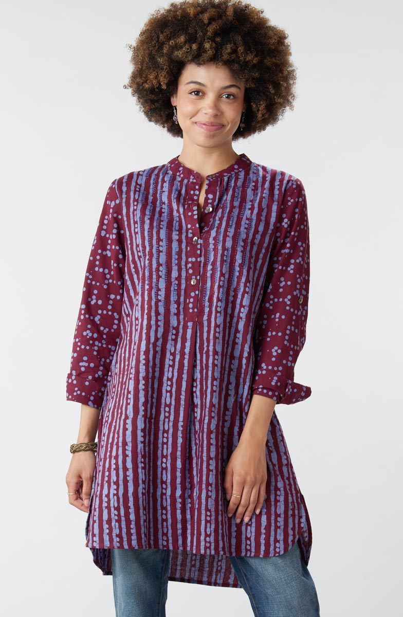 Easy kurta styling in this long tunic shirt with batik block handprints in deep red and light blue. Contrast band collar, button placket, and button-cuff sleeves. Hand embroidery embellishments. High-low shirttail hem. Long sleeves are ready to roll up.